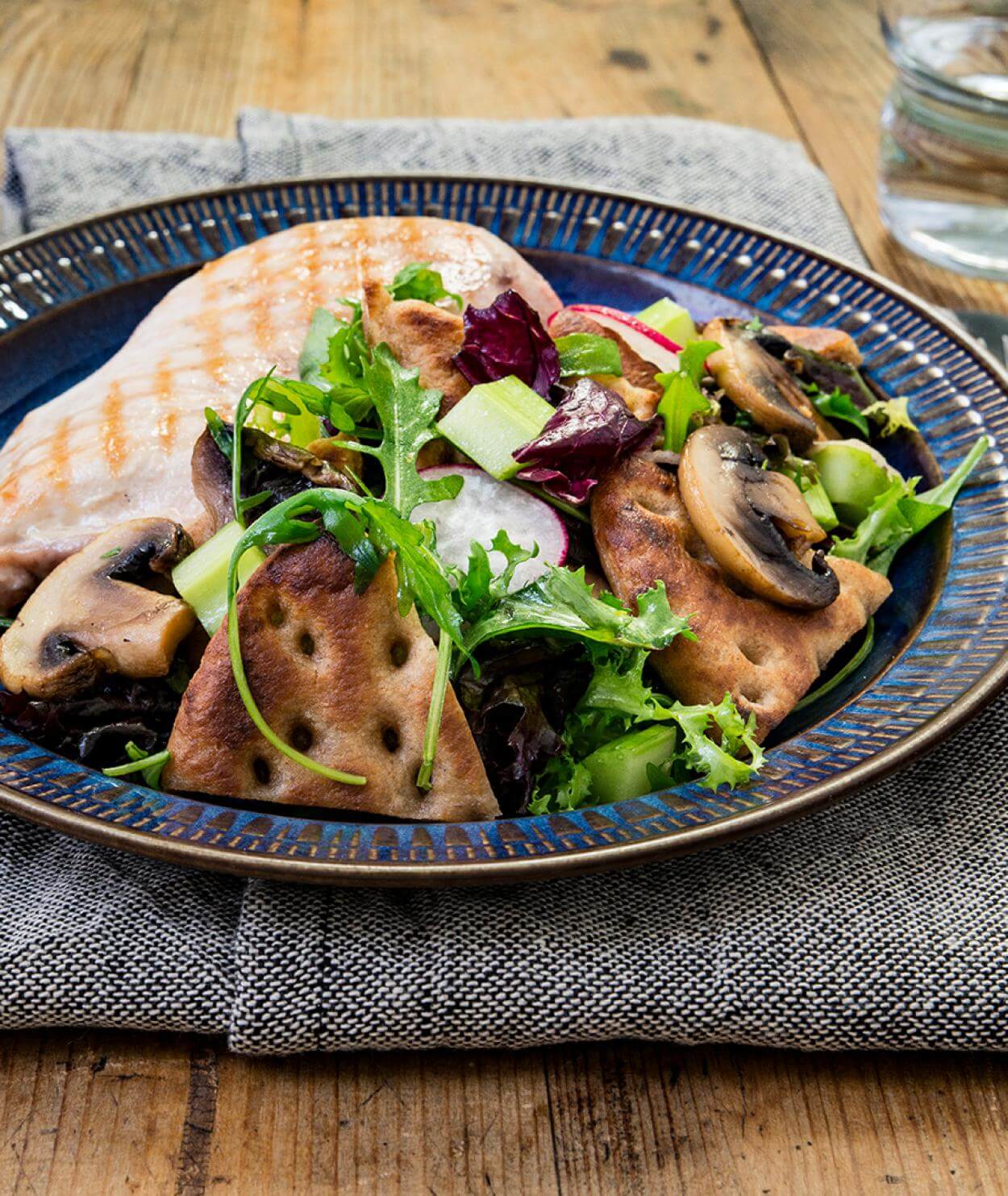 - Server salaten sammen med kylling og hvitløkskrem. Hvitløkskremen kommer til å være populær, så server gjerne litt ekstra i en skål ved siden av.