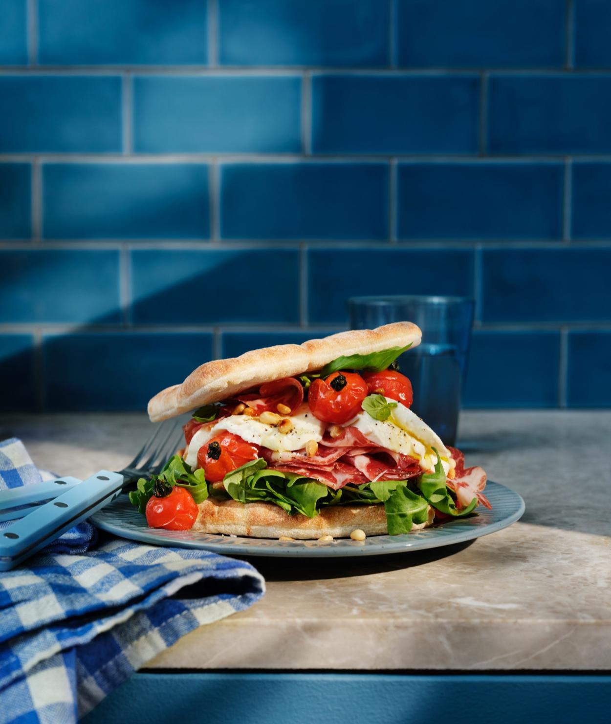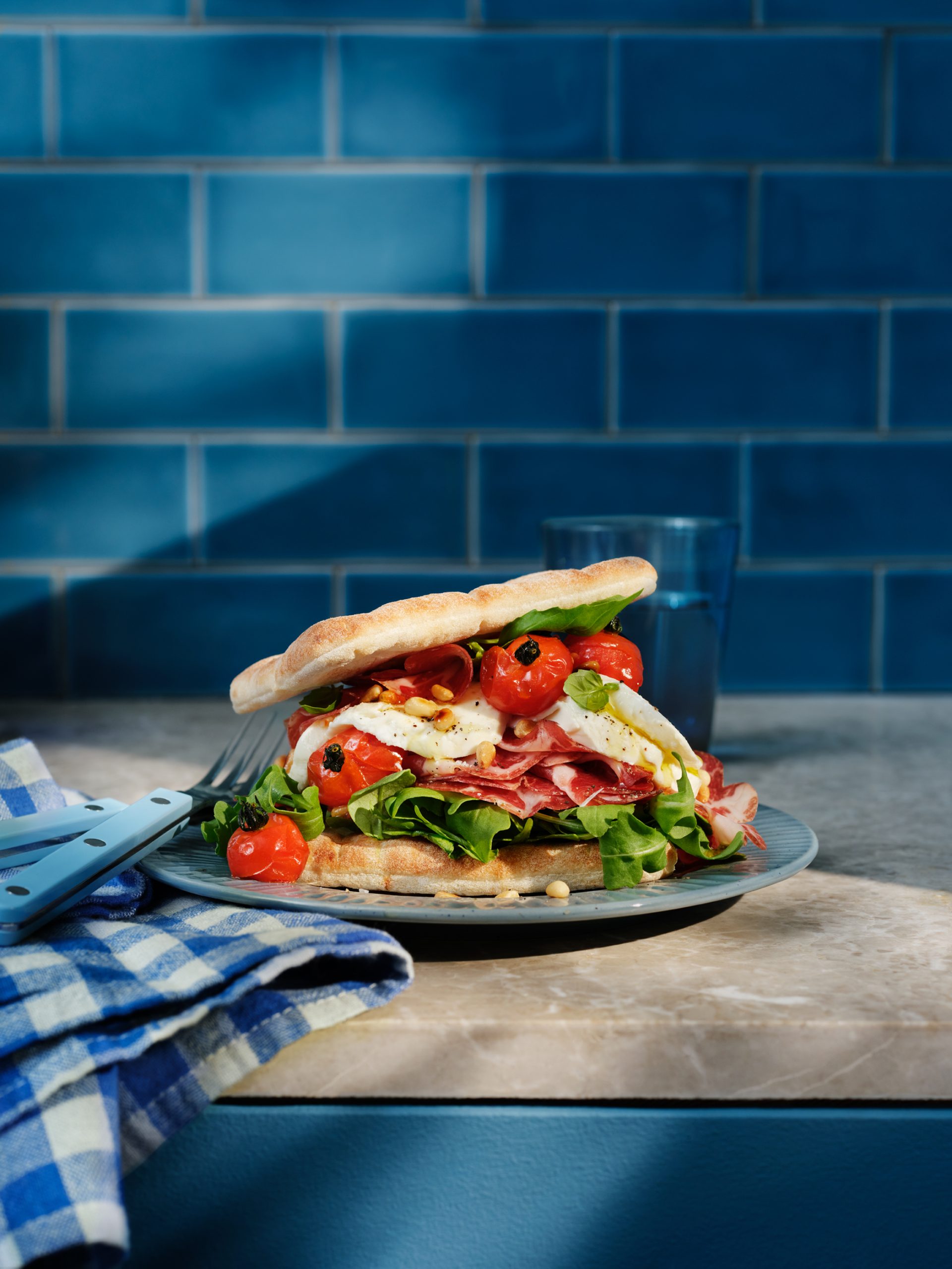 - Legg en skive på tallerken, ringle over litt olivenolje, legg så på ruccola, lufttørket skinke, mozzarella, tomat og pinjekjerner.