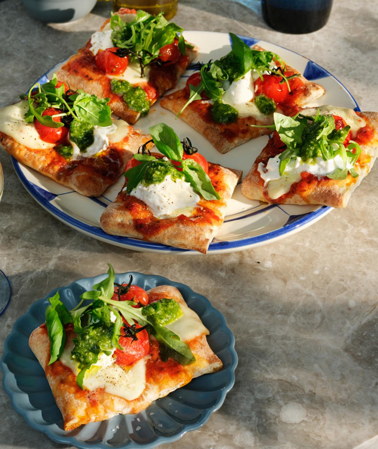 - Når pizzaen er klar toppes den med burrata, pesto, ruccola og basilikum.