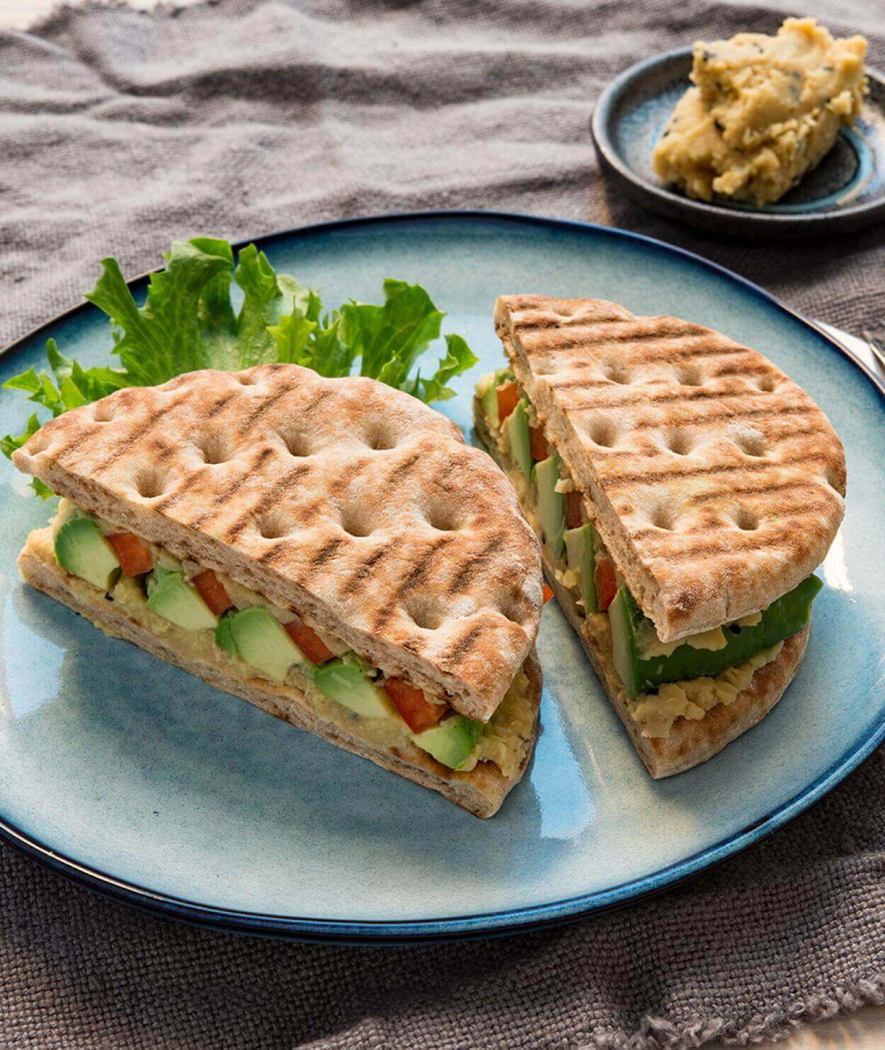 - Smør et rikelig lag med hummus på brødskivene, legg på avokado og paprika, avslutt med mer hummus og den siste brødskiven.