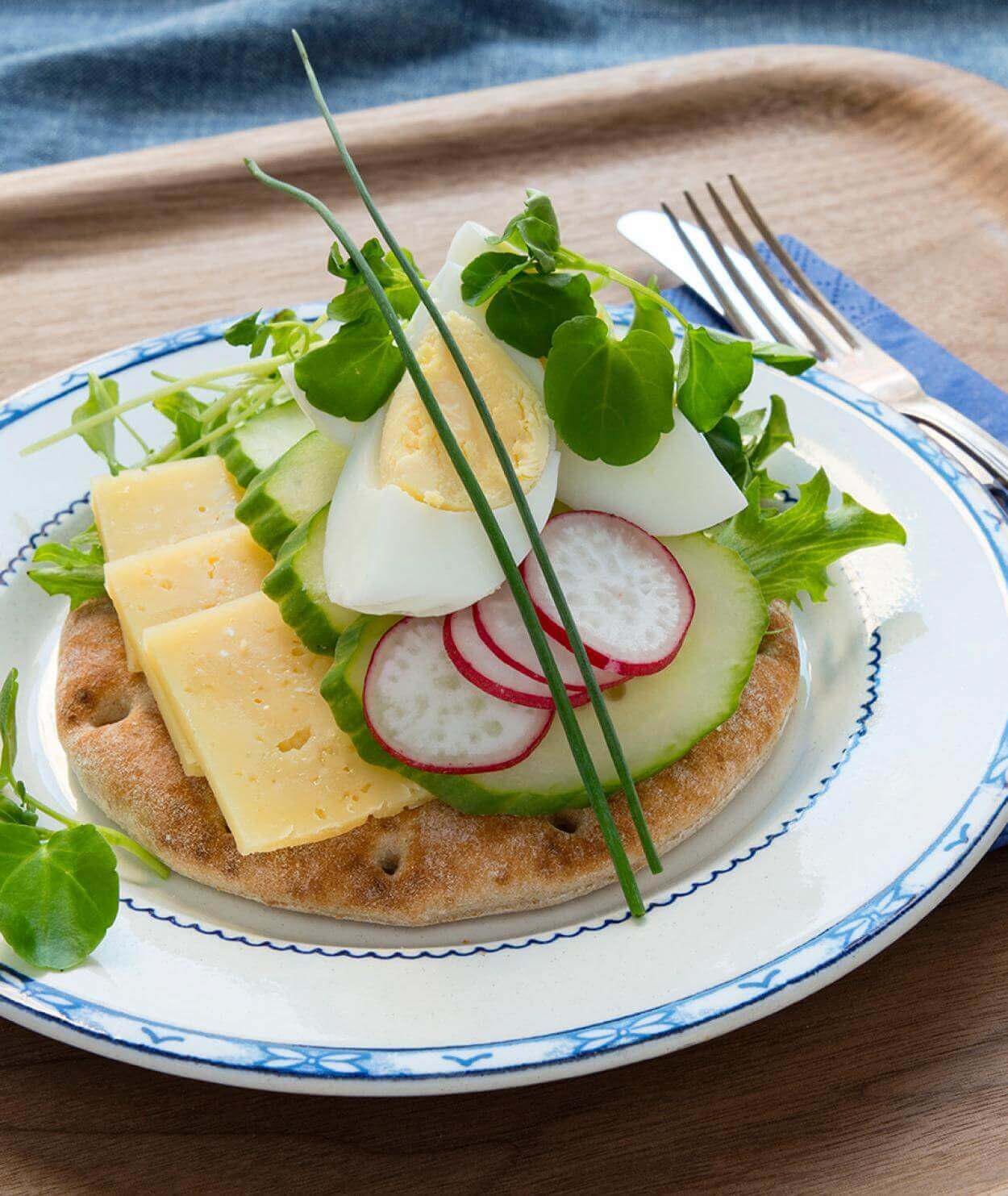 - Dekorer med salat, agurkskiver, egg i båter, reddik i skiver, karse og gressløk.