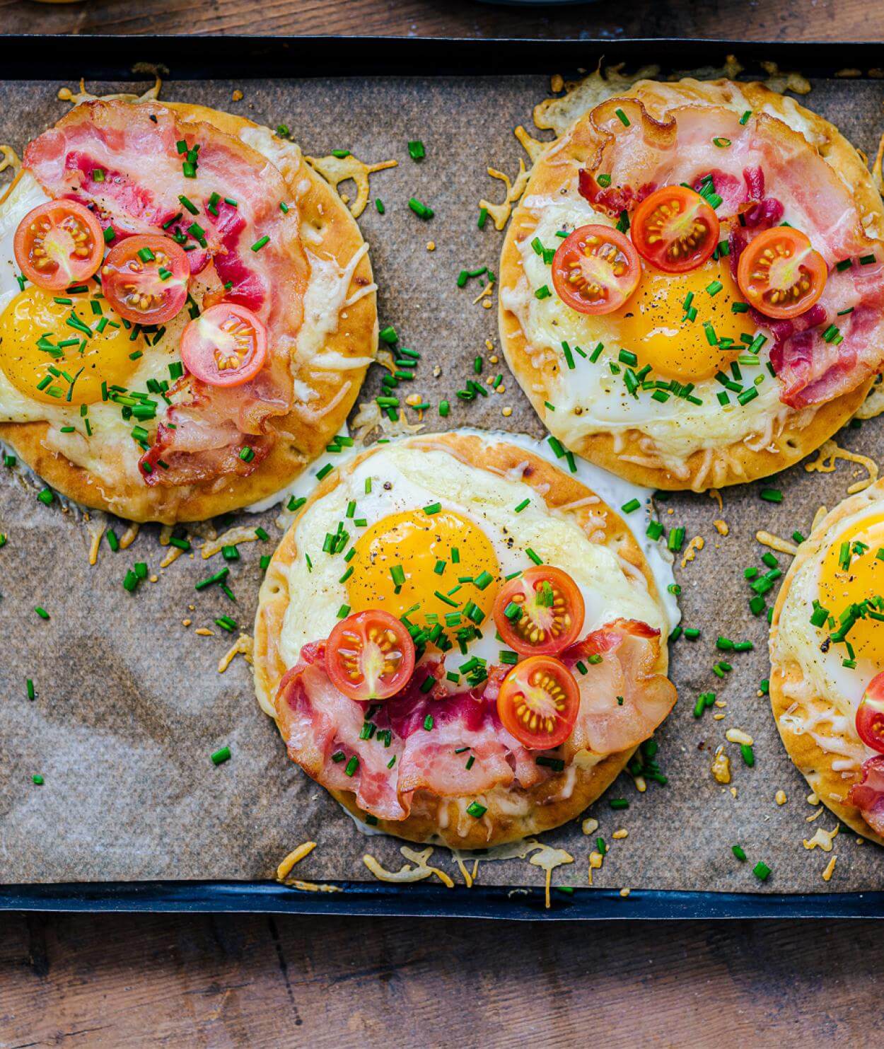 - Tips! Denne oppskriften er veldig god med bacon. Men ønsker du en vegatarisk variant så blir det minst like godt og smakssette pizzaen med f.eks fetaost. Vårt tips er da å legge tomatene på pizzaen før steking. Dryss så smuldret fetaost over egg, revet ost og tomat før de settes i ovnen. Dekorer de nystekte pizzaene med finhakket gressløk før servering. Nam, nam!