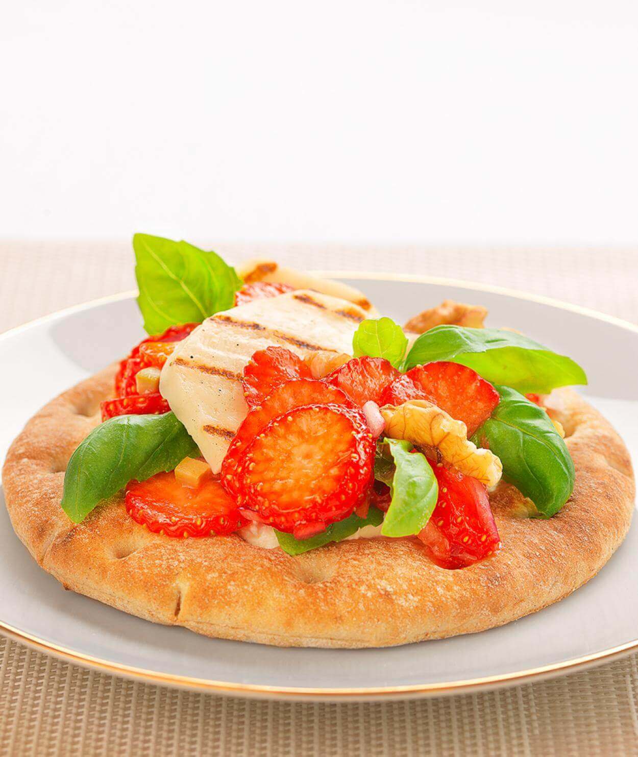 - Skjær jordbærene i skiver, hakk oliven og rødløk.