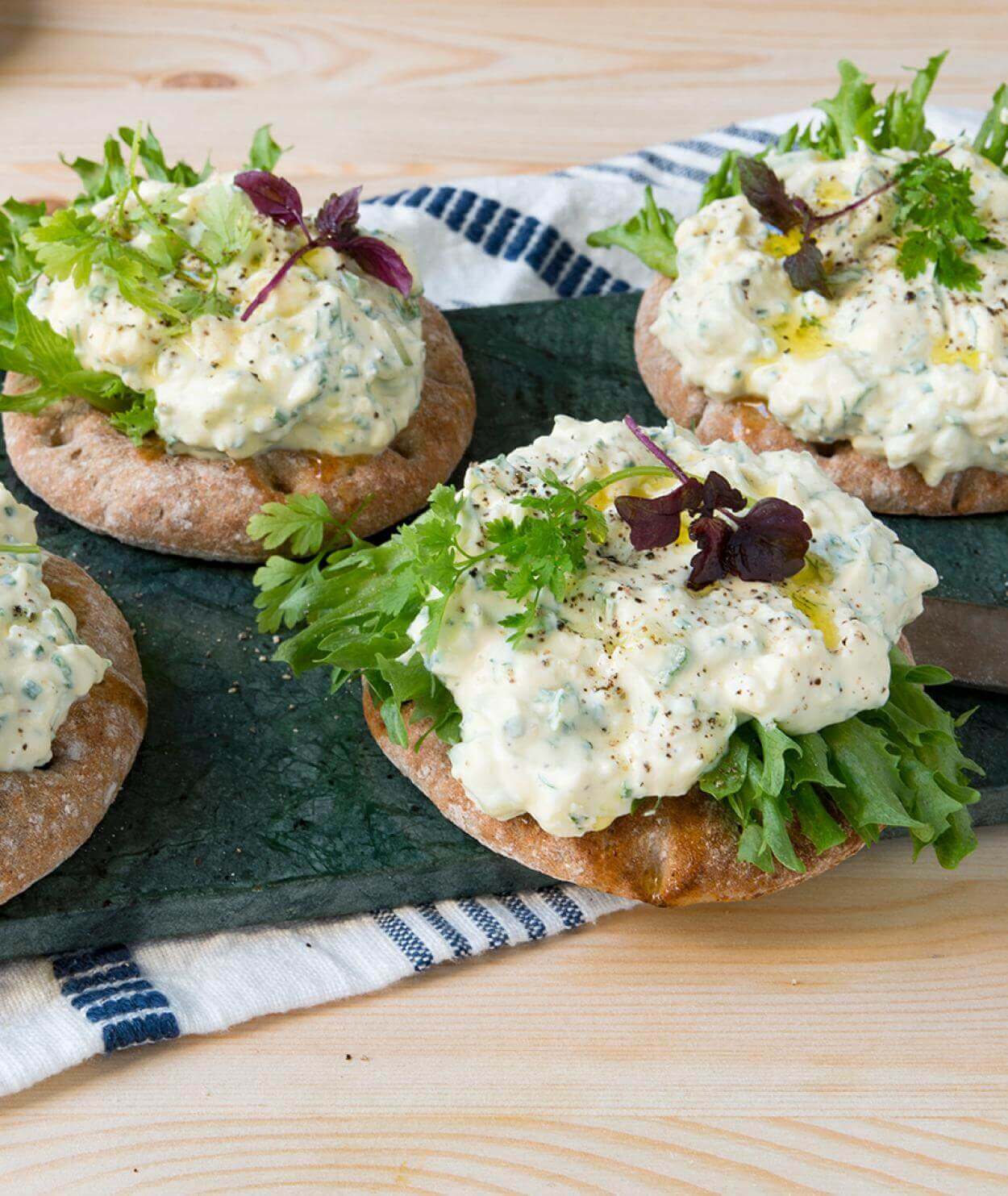 - Bland hakket egg, hakket agurk, crème fraiche, sitronsaft og hakket gressløk. Smak til med salt og pepper.