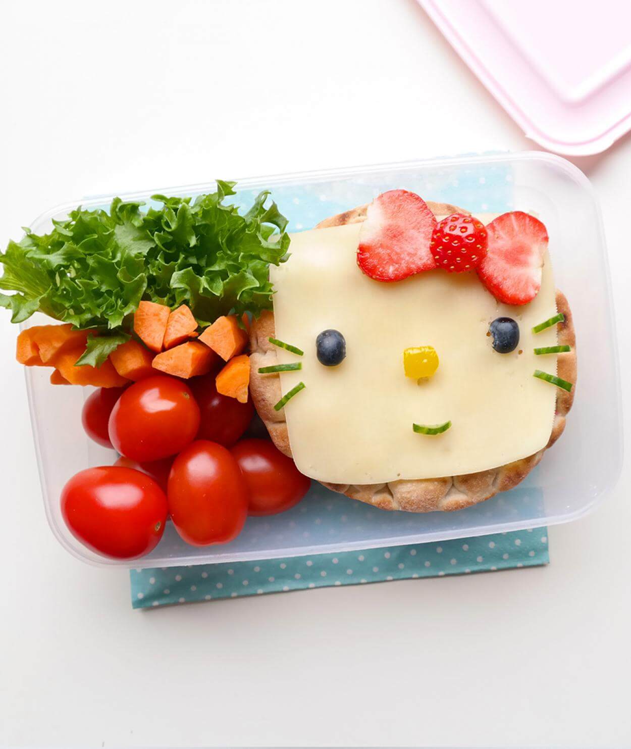 Hello Kitty har vi laget som et smørbrød med tilbehør i en matboks.