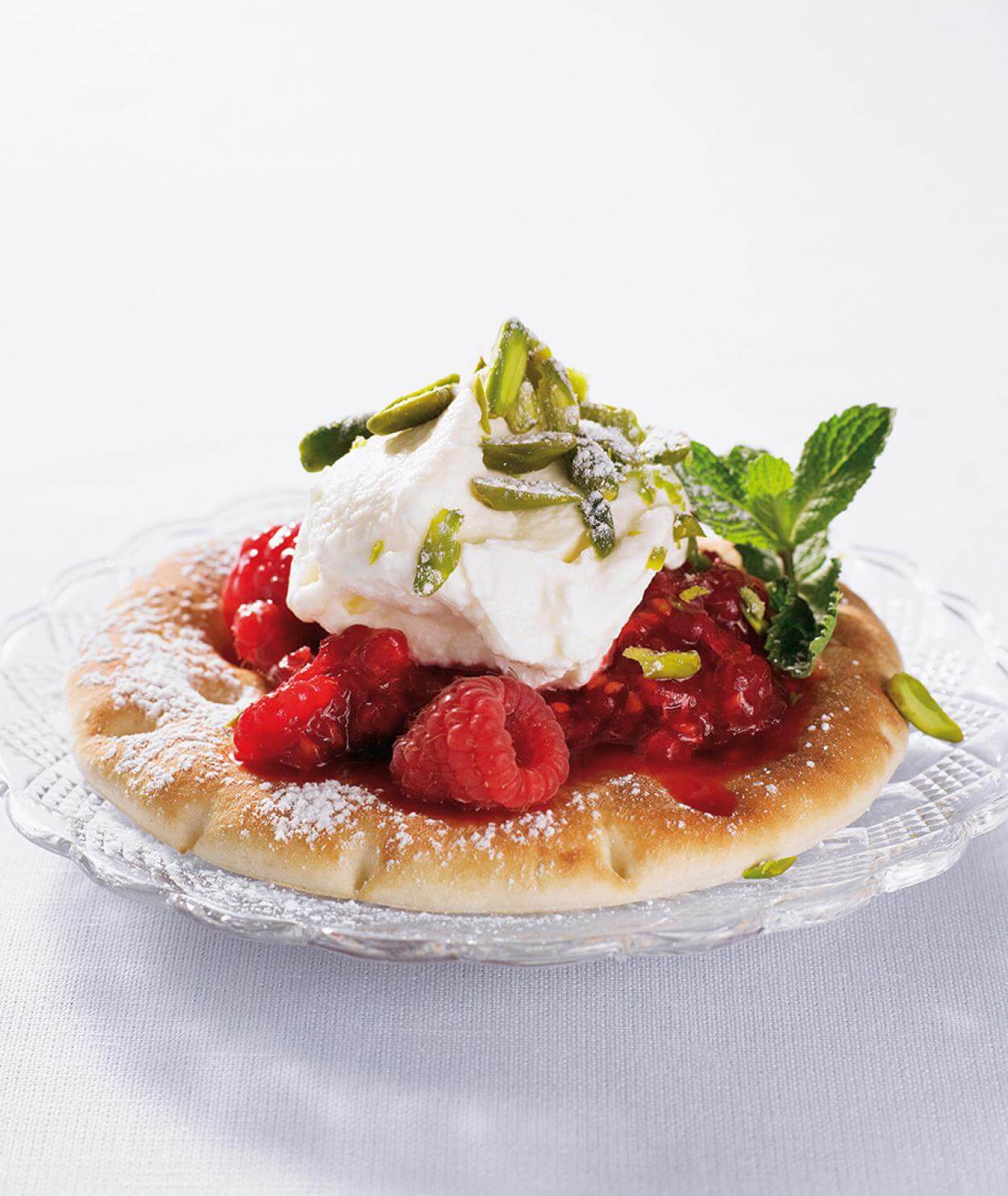 - Strø over pistasjnøttene og sikt over litt melis. Pynt med myntebladene.