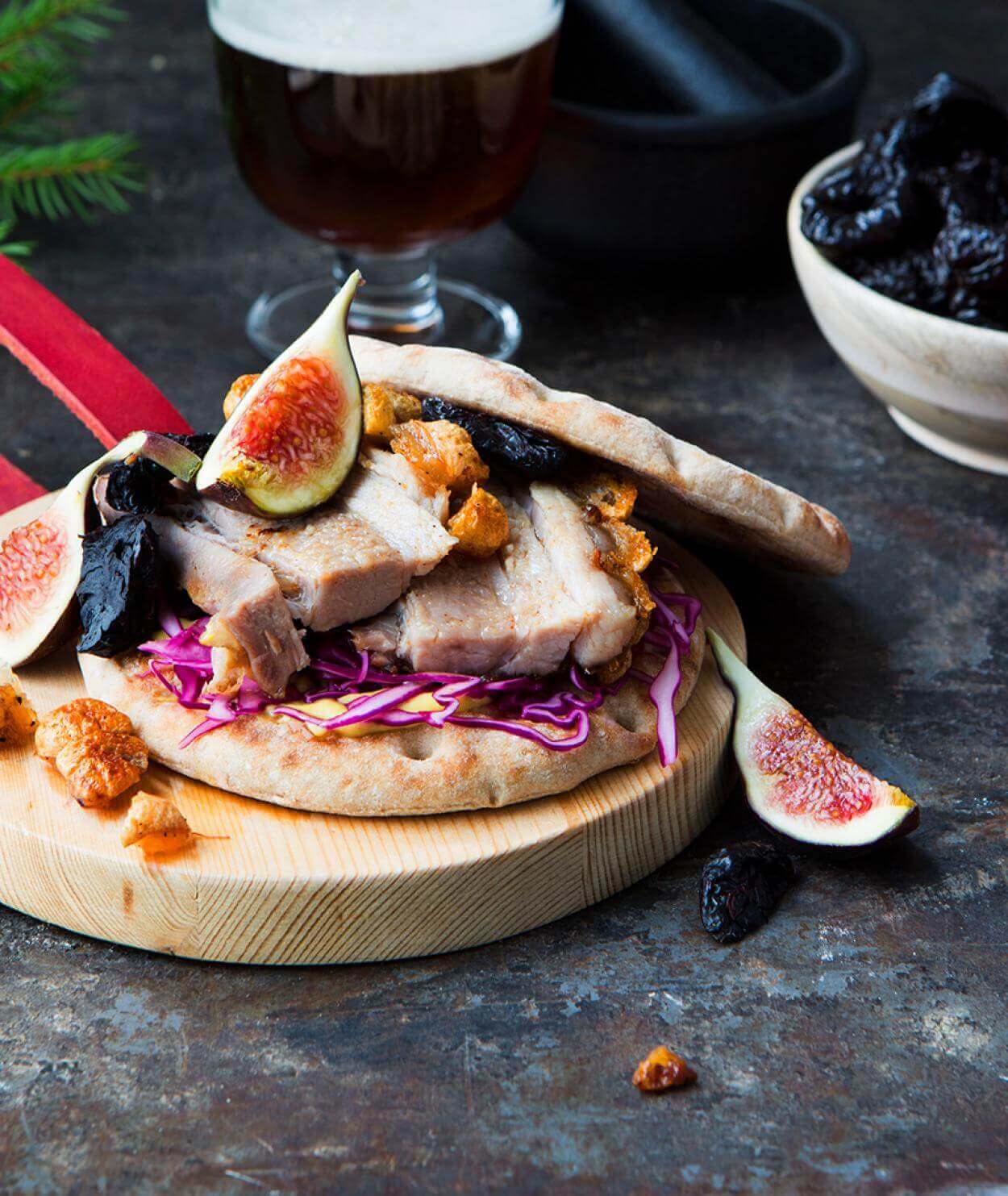 - Ribben skjæres i passe tykke skiver og anrettes på brødskiven sammen med rødkålsalaten.