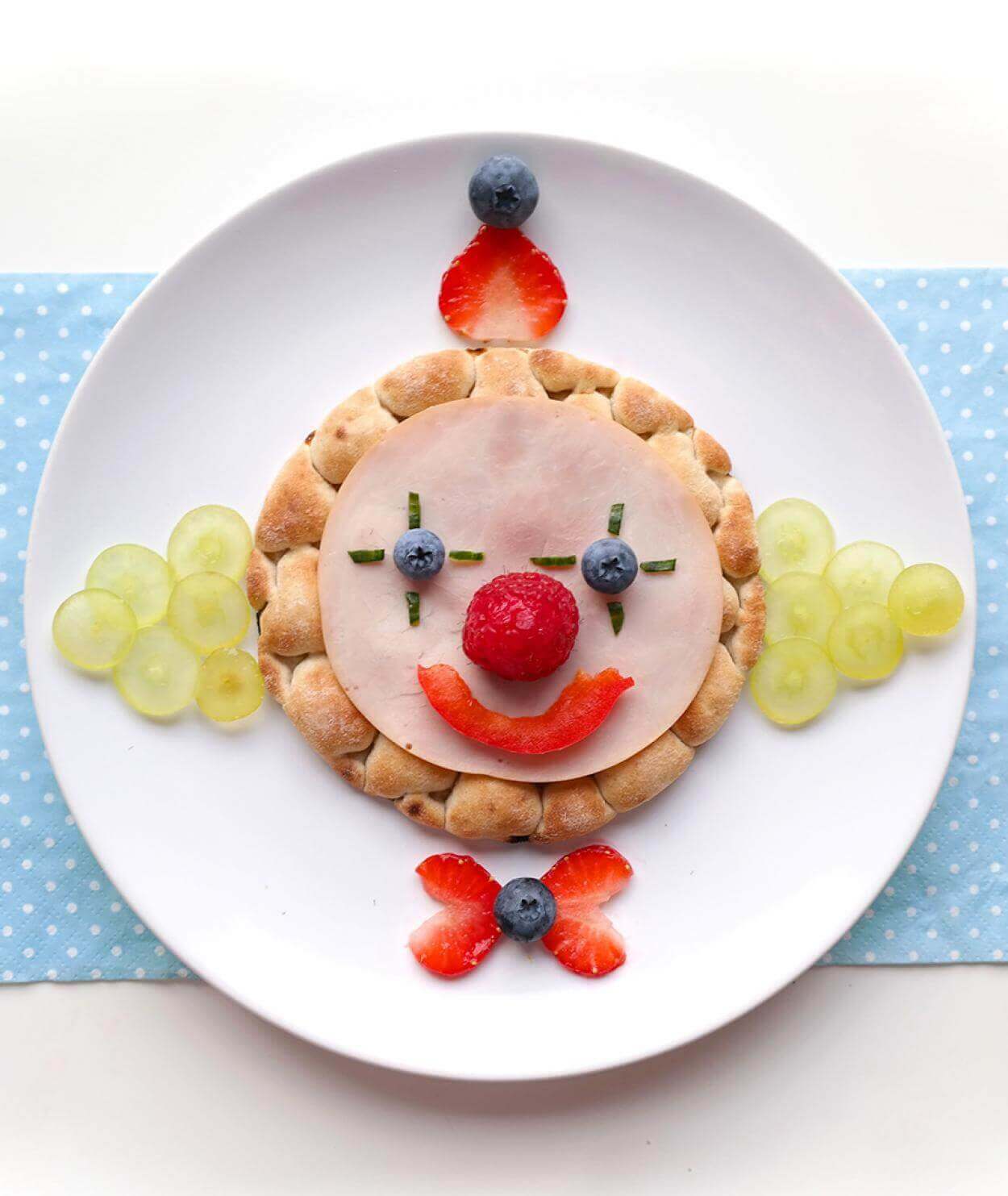 - Blåbær blir øyne, bringebær blir nese og en munn får klovnen av en bit paprika. Skjær små biter av agurk og marker øynene.