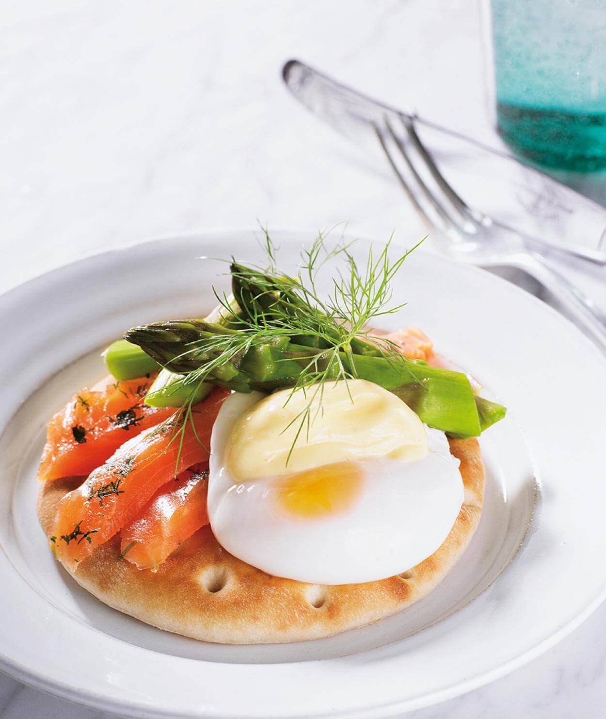 - Legg asparges og lakseskiver på brødet, legg så på egget og hell så over hollandaisesausen. Dekorer med dill.