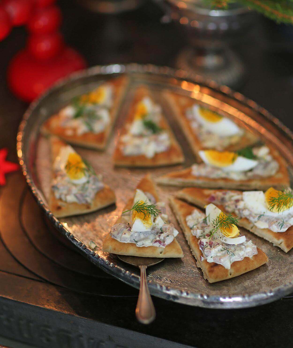- Del hver brødskive i to biter. Legg sildeblandingen på hver snitte og dekorer med egg, dill og litt rødløk.