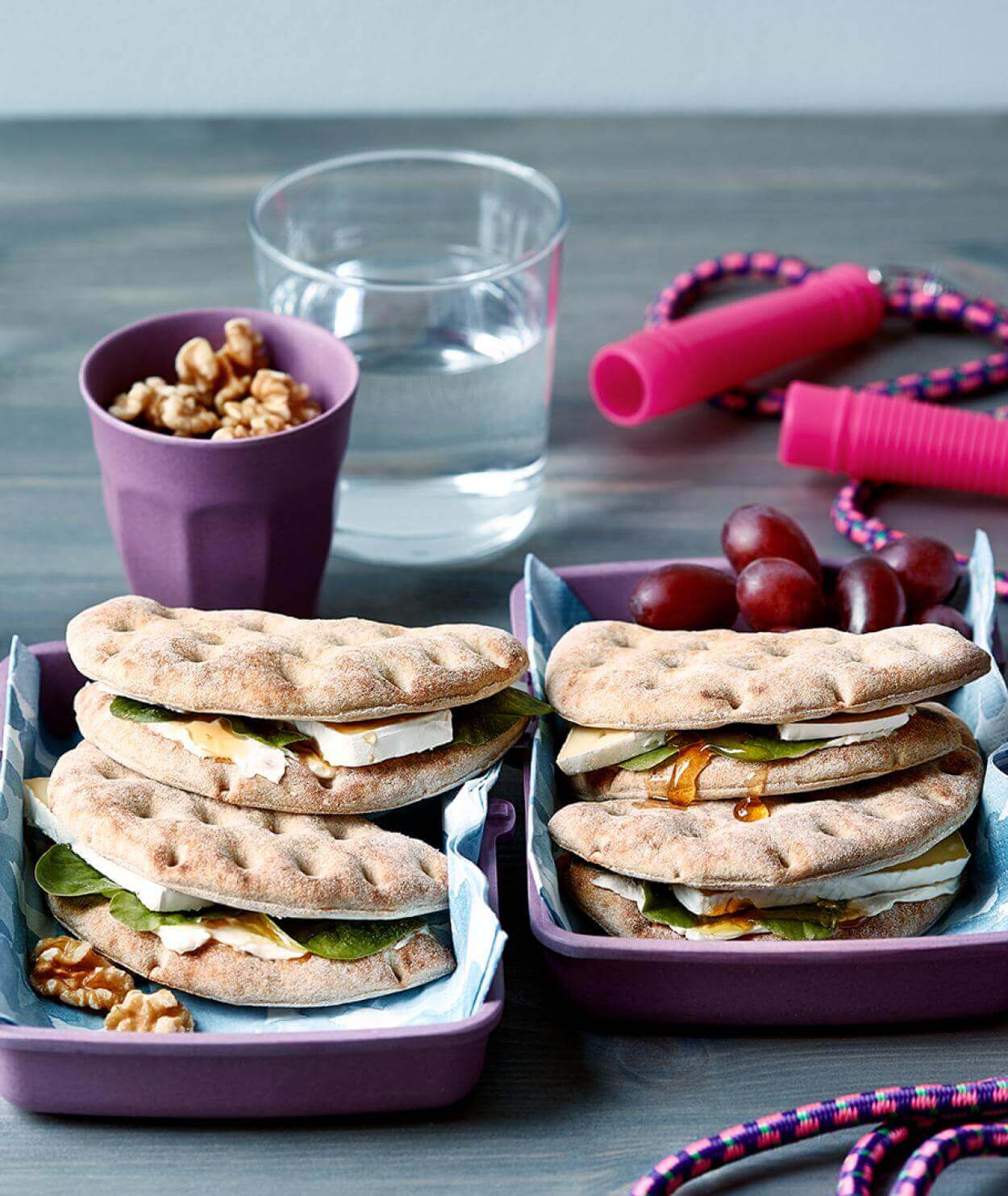 - Brie skjæres i skiver og fordeles på to av Fullkornskivene. Legg deretter på spinat- eller salatblader og drypp noen dråper honning over.