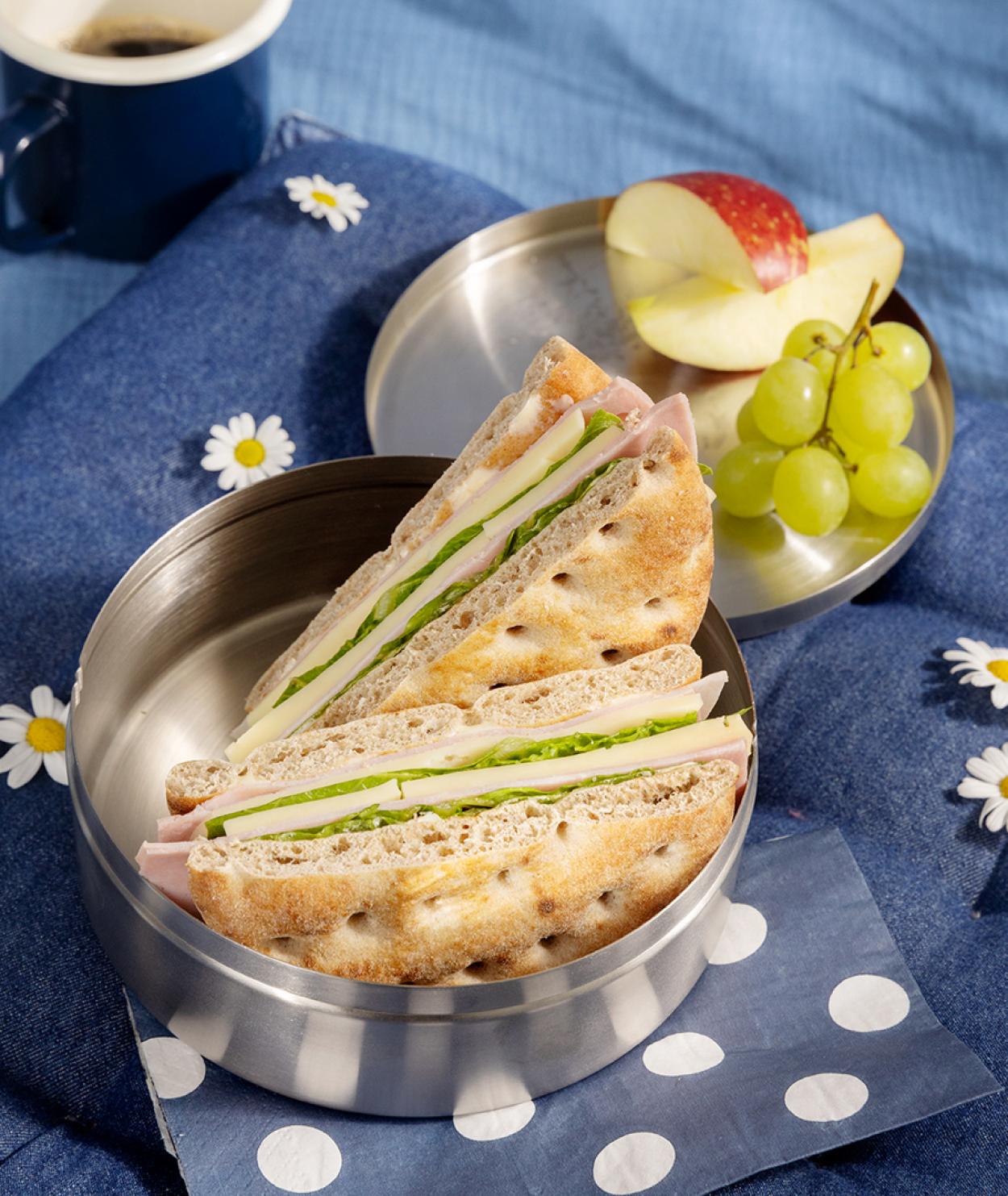 - Bred smør på den ene brødskiven, legg deretter på salat, ost og skinke og avslutt med den siste brødskiven.