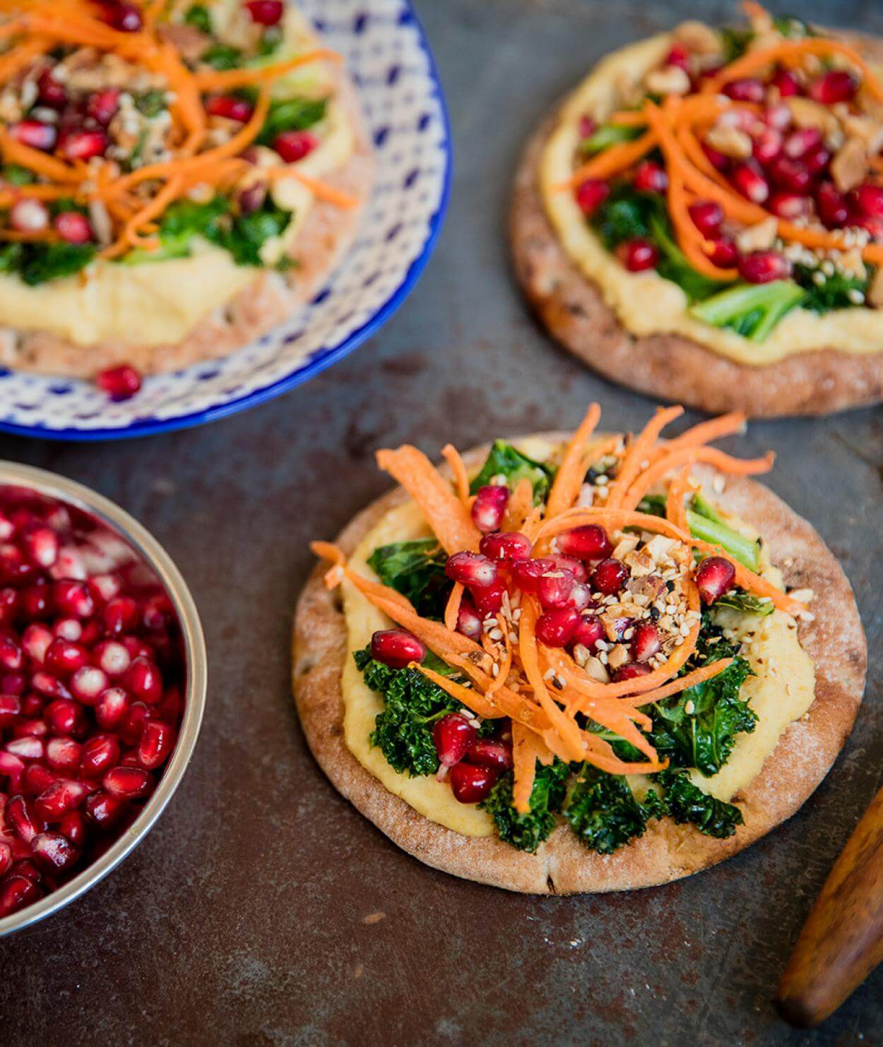 - Fordel hummus på brødskivene, legg på grønnkål og gulrot.
