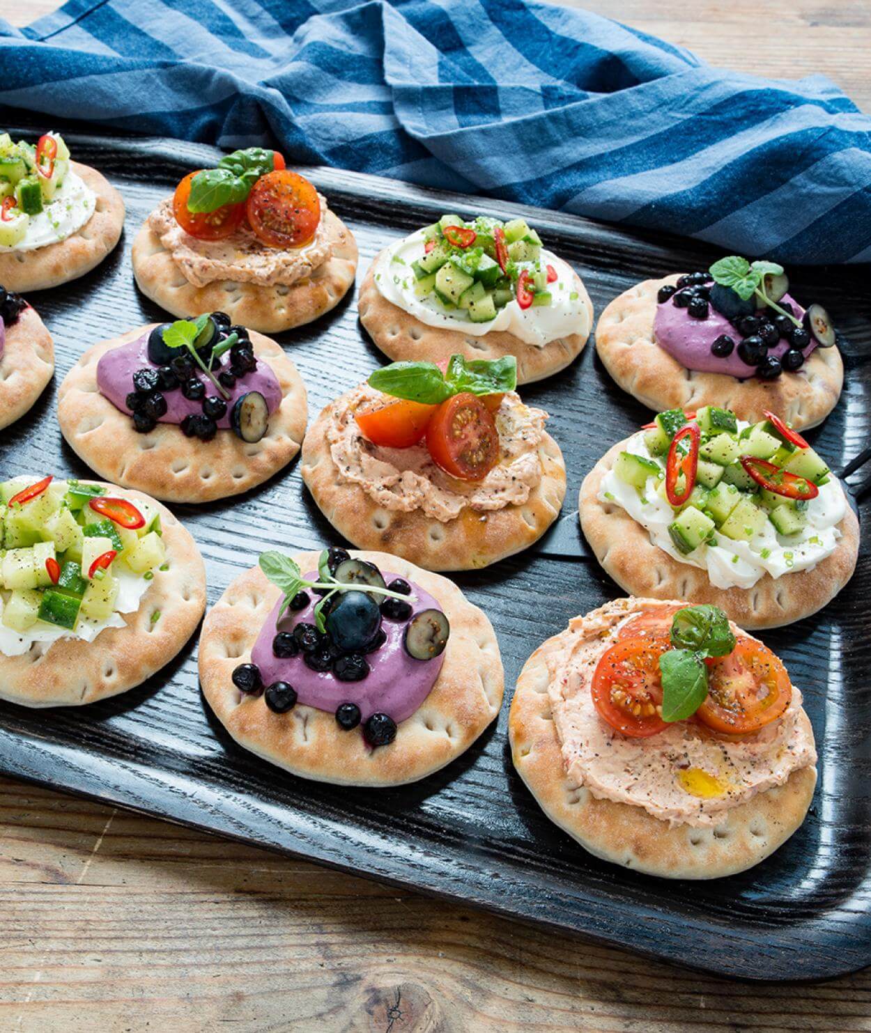 Minismørbrød med topping av tomat, agurk eller blåbær