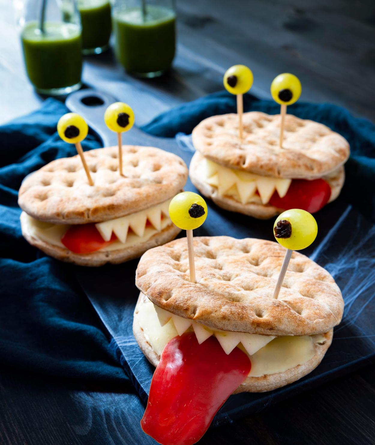 - Skjær en bit rød paprika og legg den bak «tennene», slik at det ser ut som en tunge.