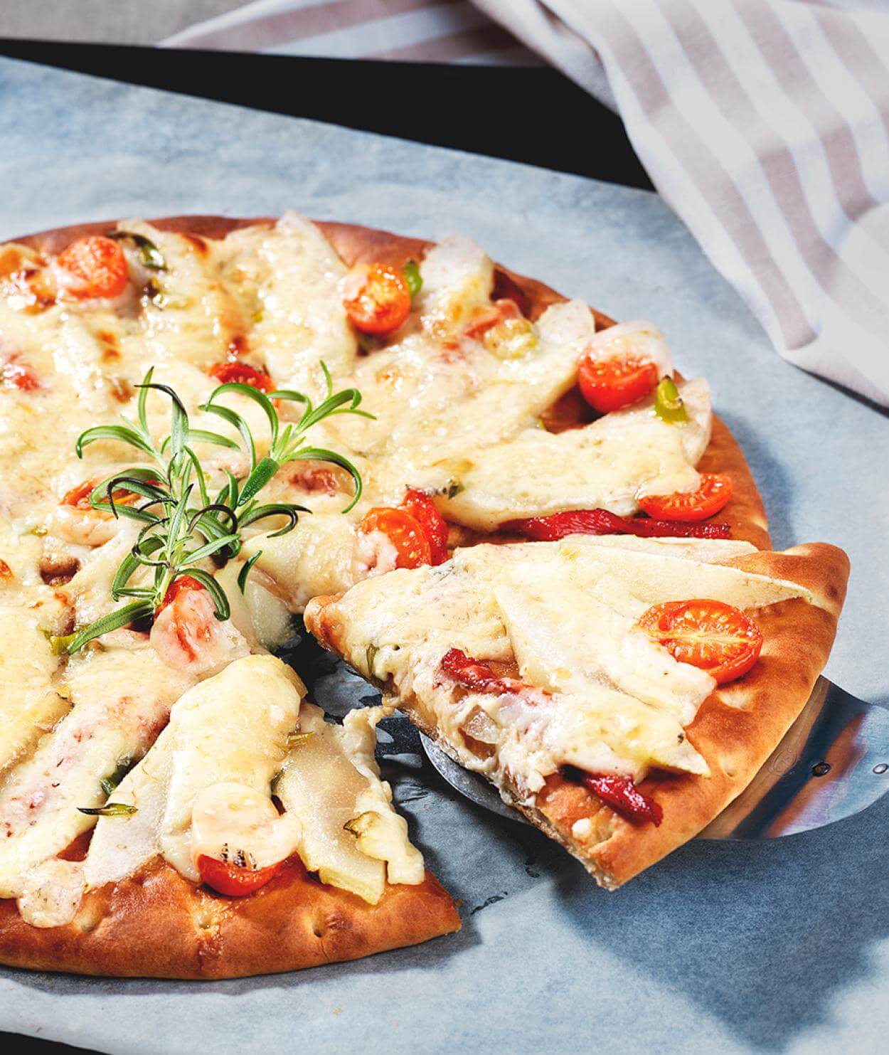 - Stekes i ca 10-15 minutter eller til osten har smeltet og pizzaen har fått en fin farge. Dekorer med rosmarin.