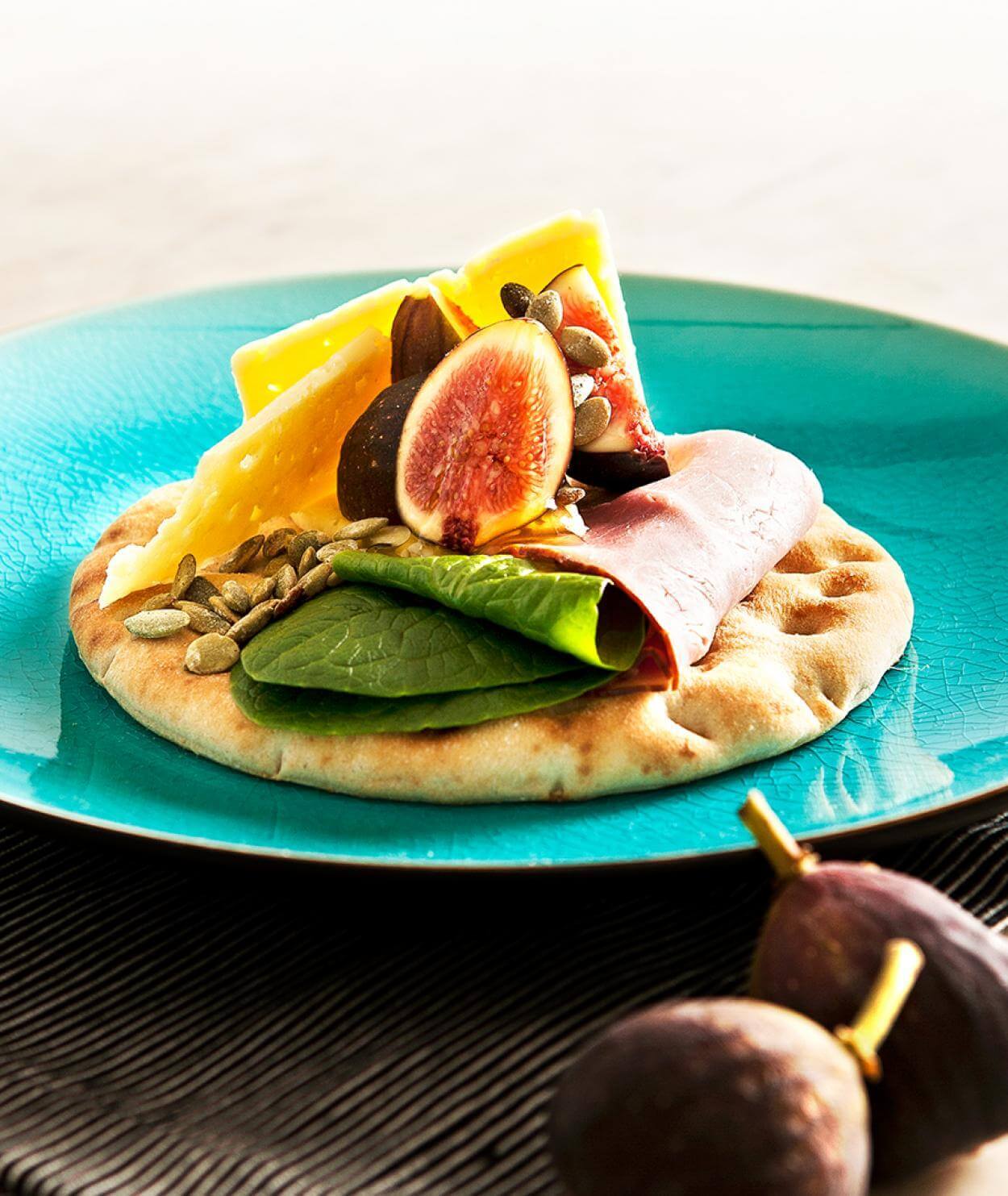 - Legg romanosalat i bunn på brødet, legg så på skinke og fiken, samt osten og strø til slutt over gresskarkjerner.