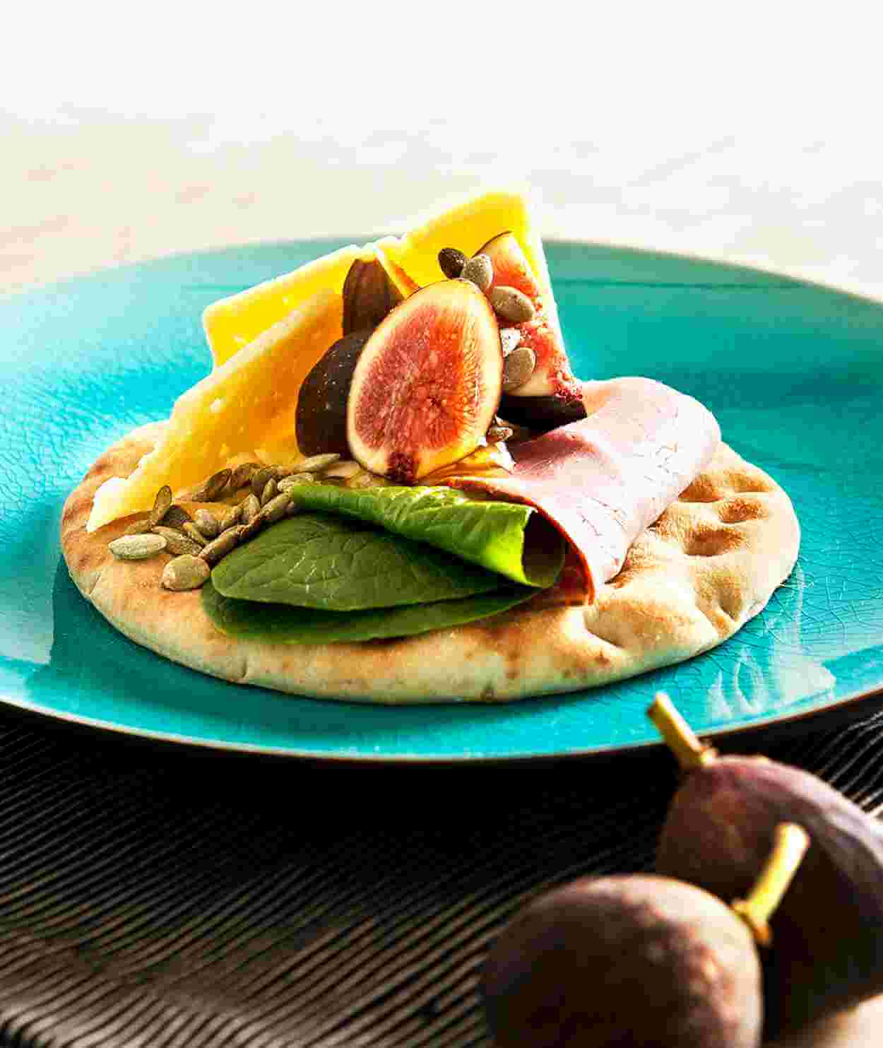 - Legg romanosalat i bunn på brødet, legg så på skinke og fiken, samt osten og strø til slutt over gresskarkjerner.