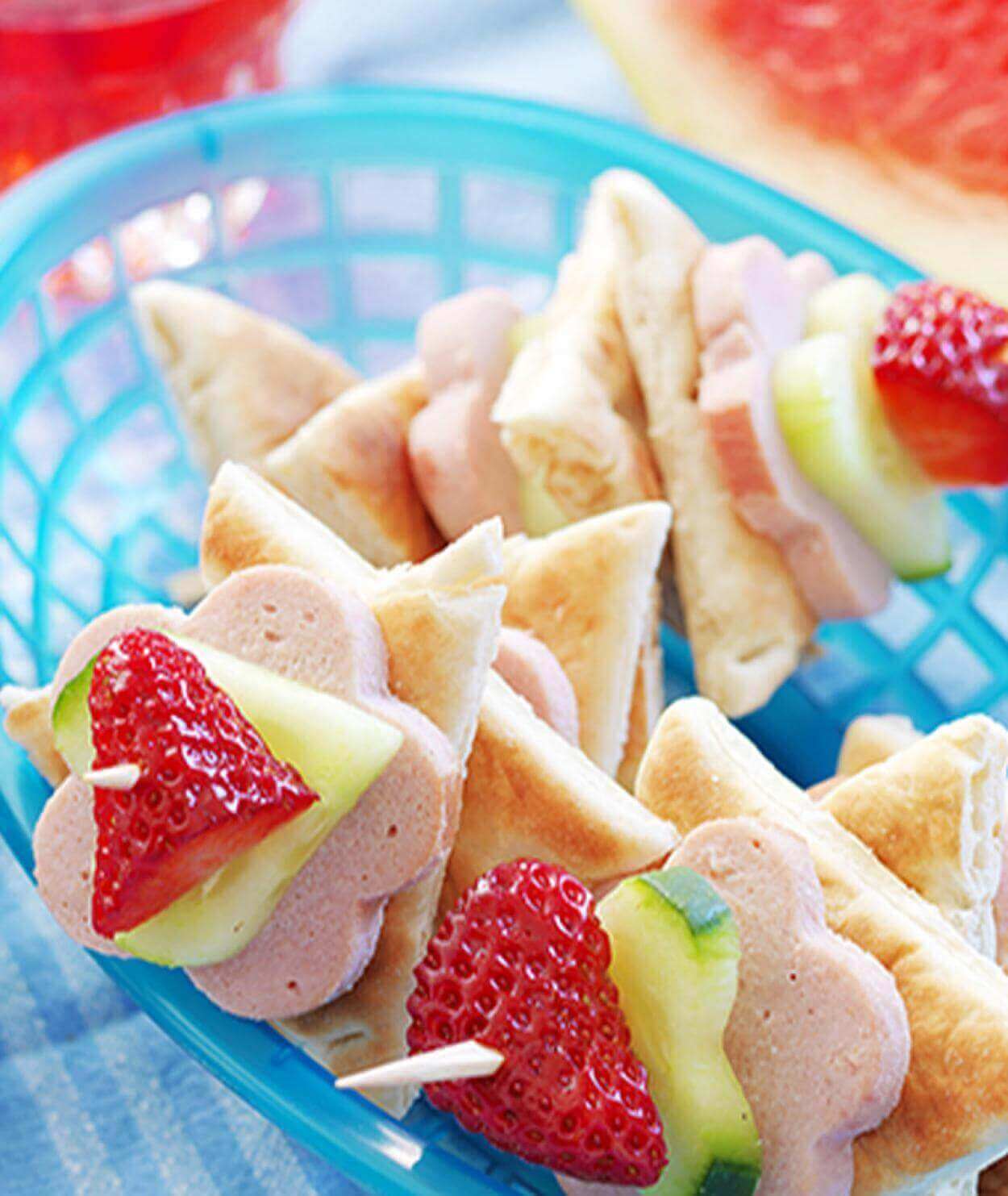 - Deretter trer du brød, falukorv og slangeagurk lagvis på et grillspyd. Avslutt med jordbær.