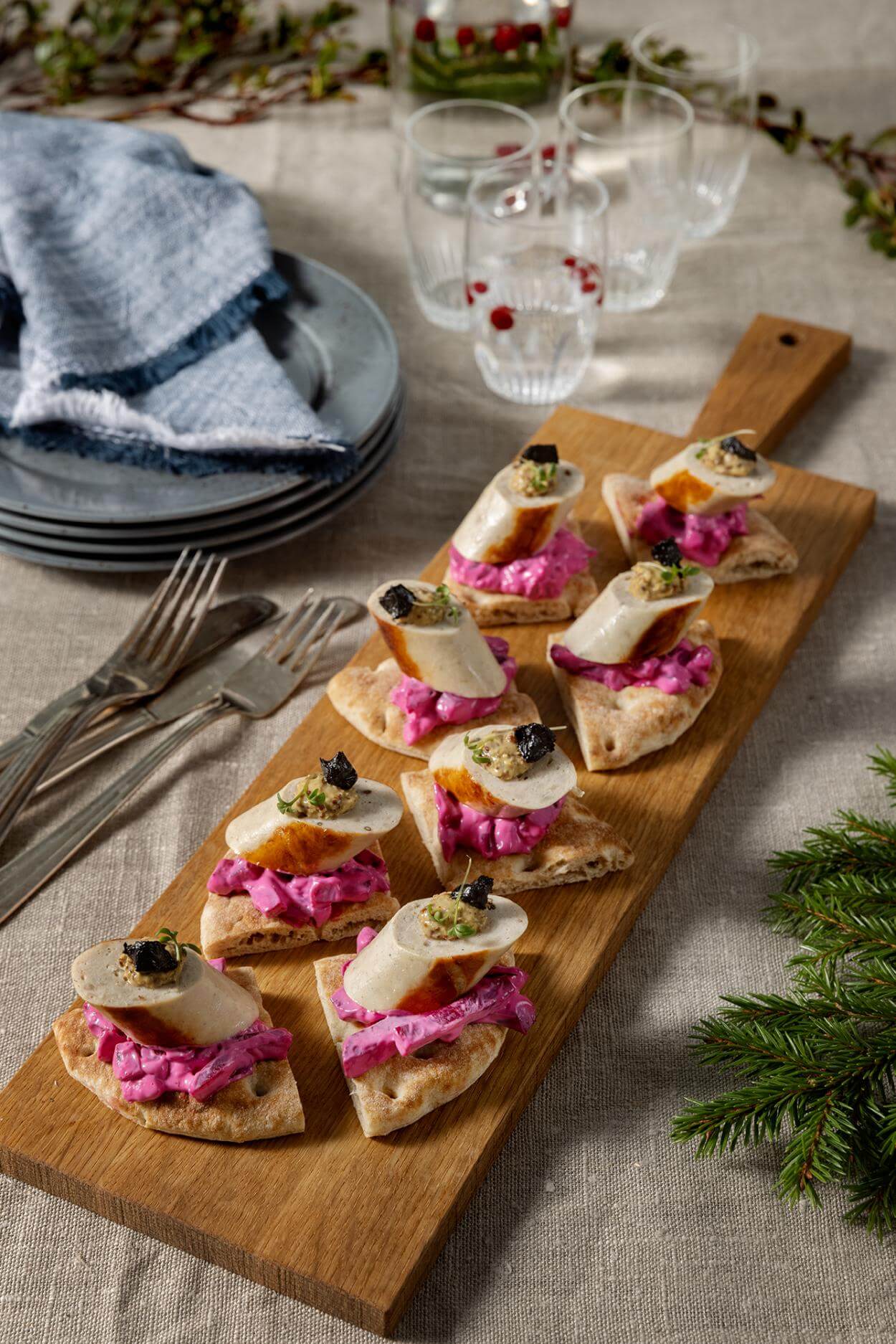 - Legg en god spiseskje med rødbetesalat på hver brødbit, deretter pølsebiter og avslutt med litt sennep og svisker.