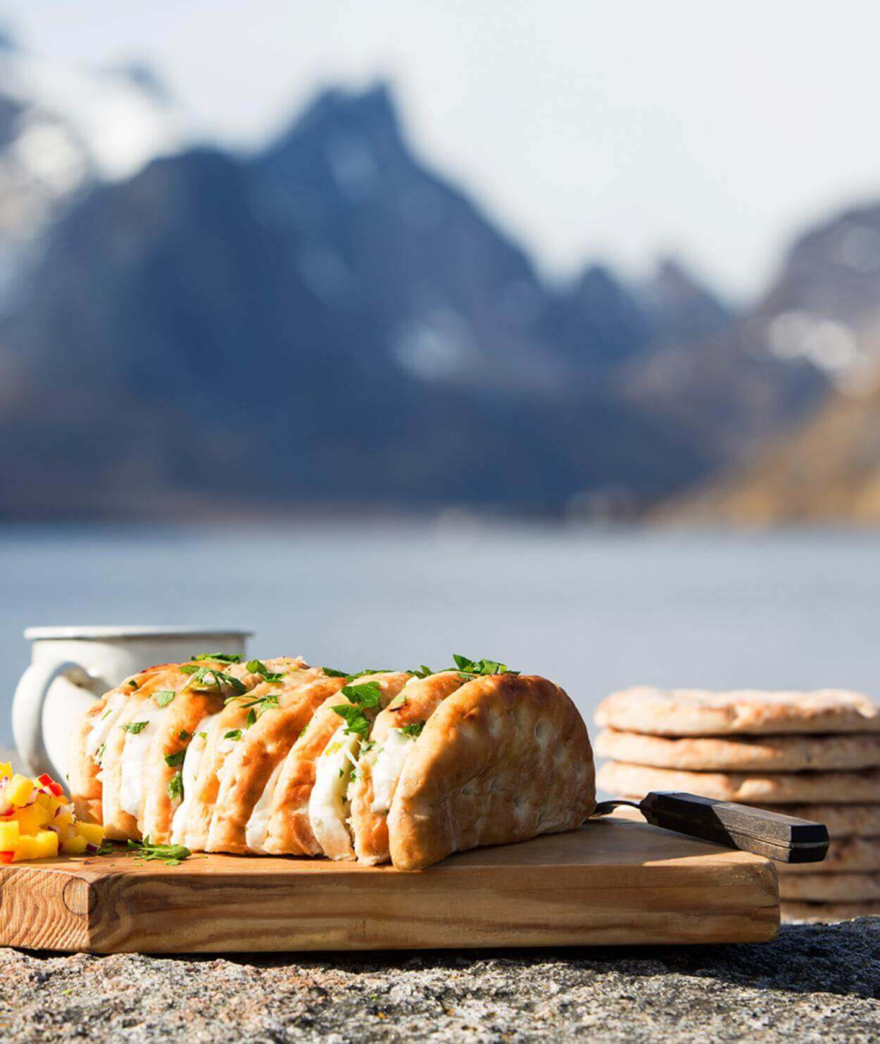- Pakk brødet i et par lag med aluminiumsfolie. Brødet varmes på bålet, husk å vende brødet jevnlig, slik at det ikke blir brent.