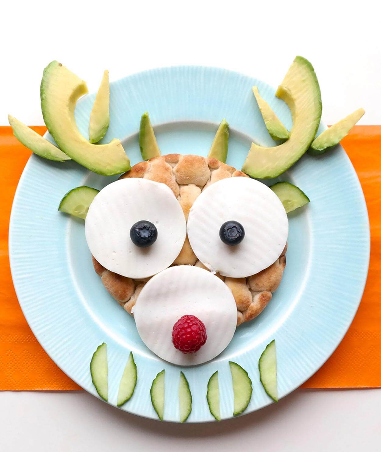 - Del avokadoen og skjær to store skiver, samt noen mindre biter som skal være tagger på reinsdyrets horn. Drypp gjerne noen dråper sitronsaft over skivene så de ikke blir brune.