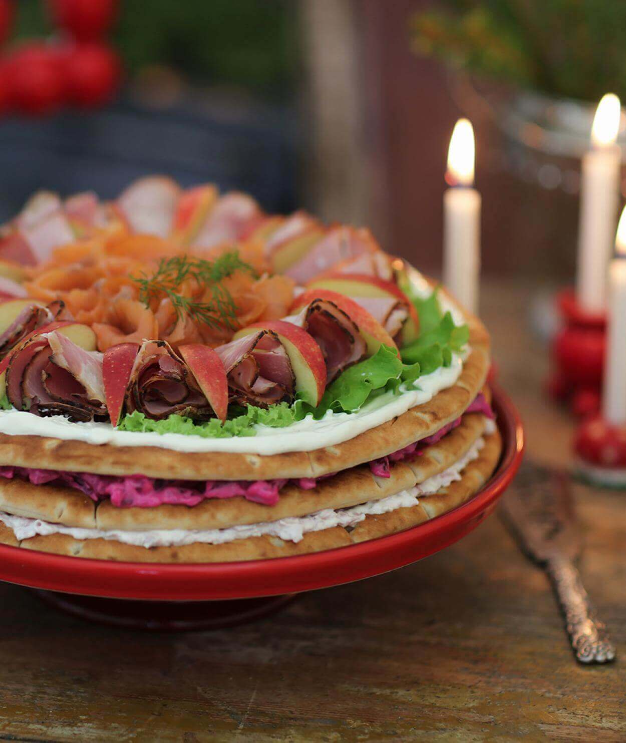 - Legg salat på toppen av kaken og rull skinkeskivene til små roser. Legg de rundt på smørbrødkaken. Eplet skylles, skjæres i skiver og stikkes mellom skinkebitene. Lag roser av lakseskivene og plasser de i midten kaken. Avslutt gjerne med litt fersk dill. Server.