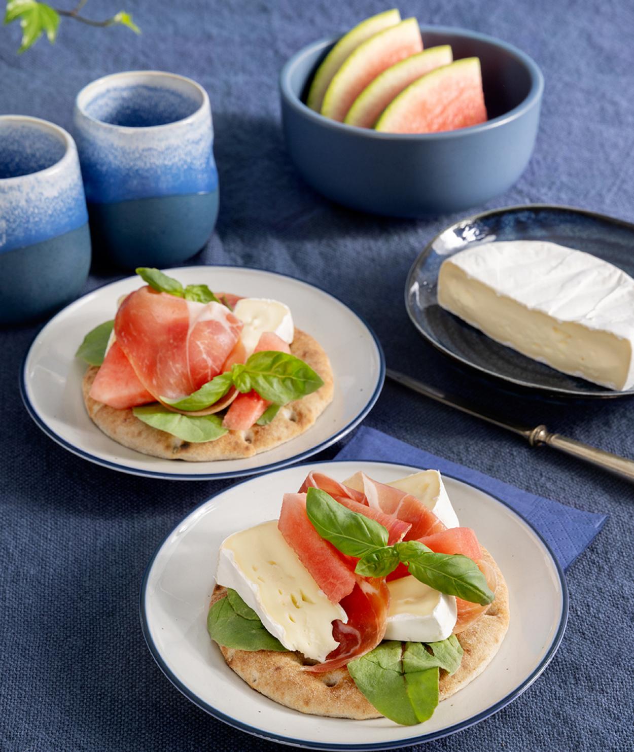 - Bred smør på brødet. Legg på salat, skiver med brie og litt vannmelon.
