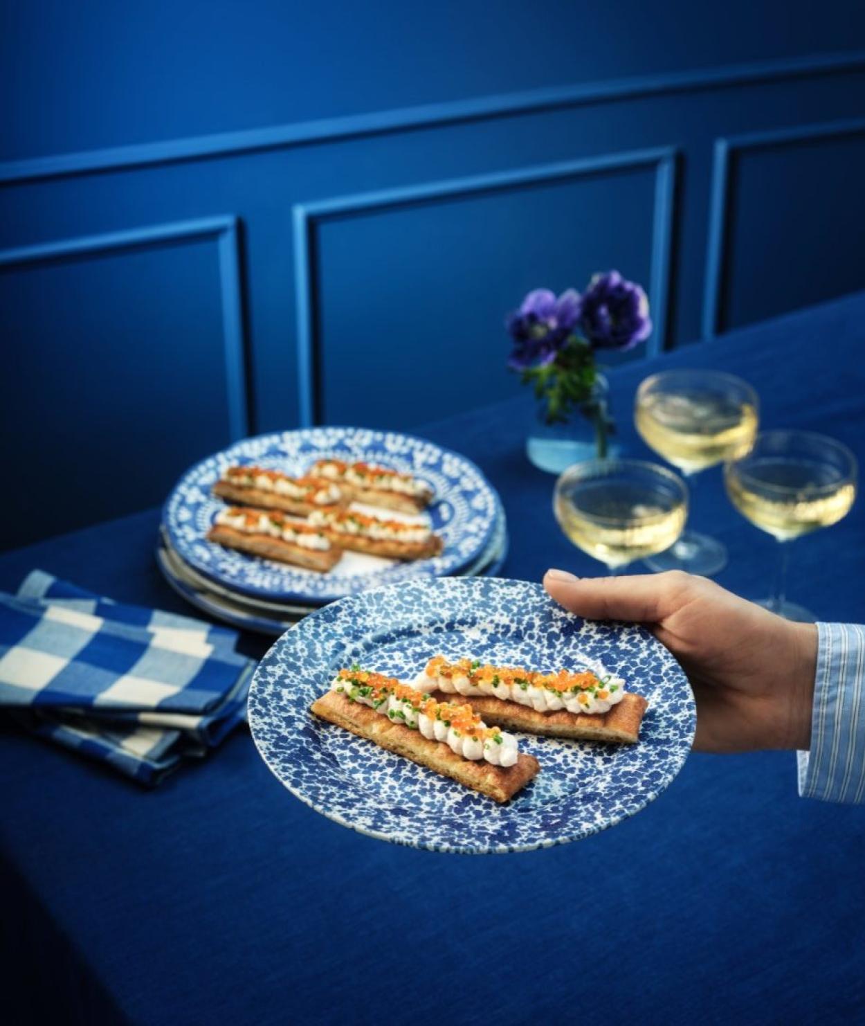 - Legg brødbitene på et serveringsfat og sprøyt lakserøren over, dekorer med finhakket gressløk.