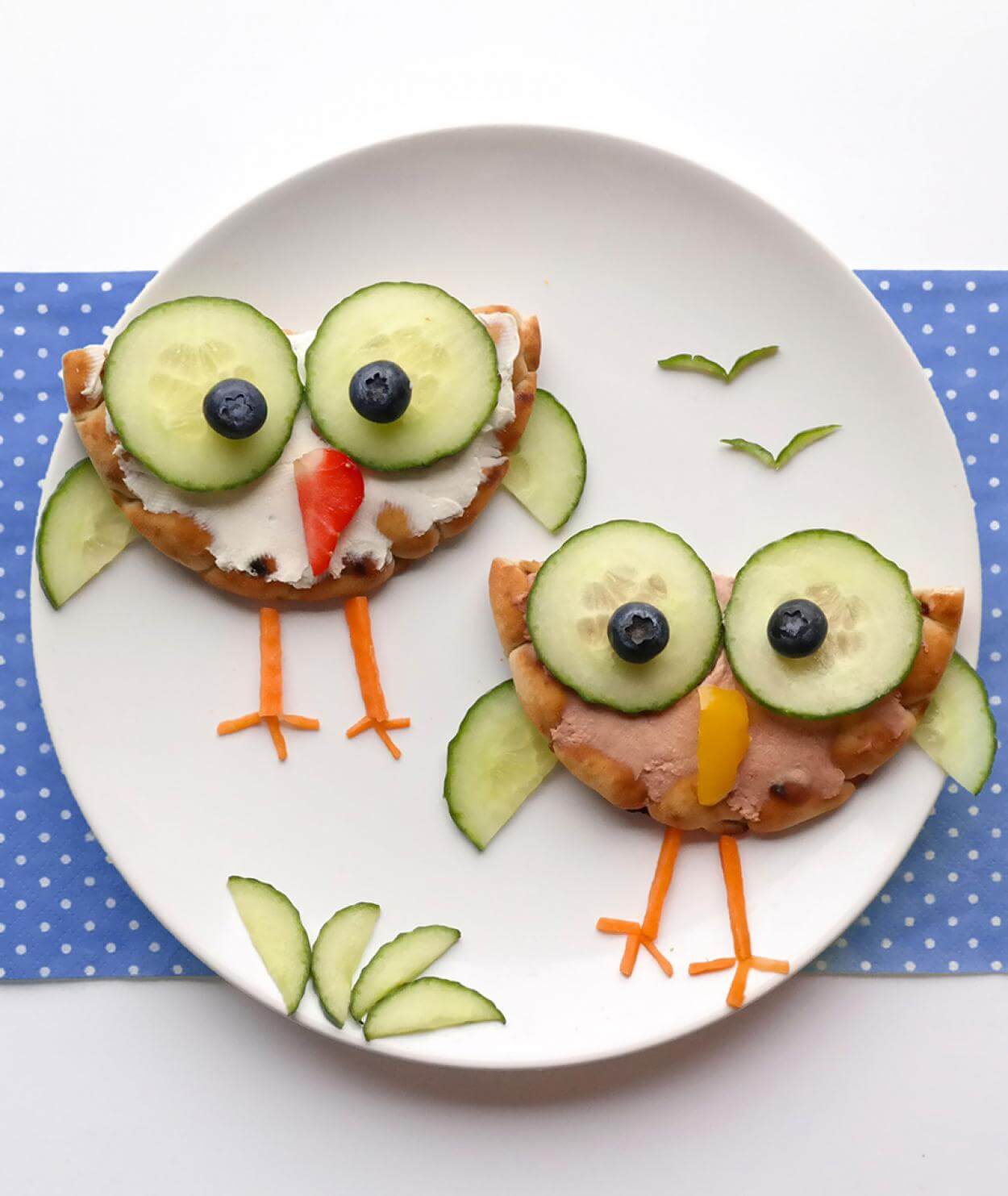 - Ta en jordbær-/paprikabit og lag uglenes neser, ben lages av små gulrotstrimler.