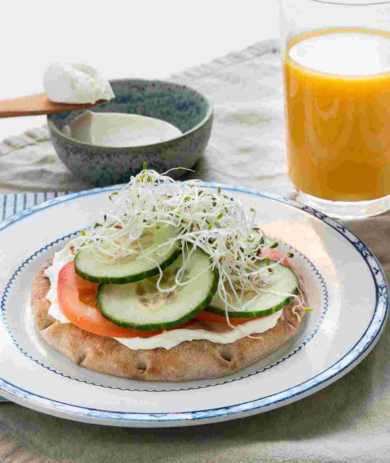 - Bred smørost på brødskivene og legg på agurk og tomat, topp det hele med friske spirer. Avslutt gjerne med et dryss av salt og nymalt pepper.