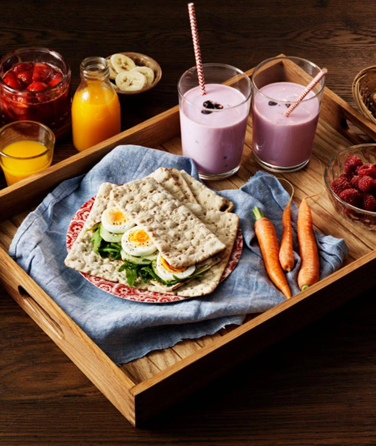 - Toppa med ett skivat kokt ägg, gurka, ruccola och svartpeppar.