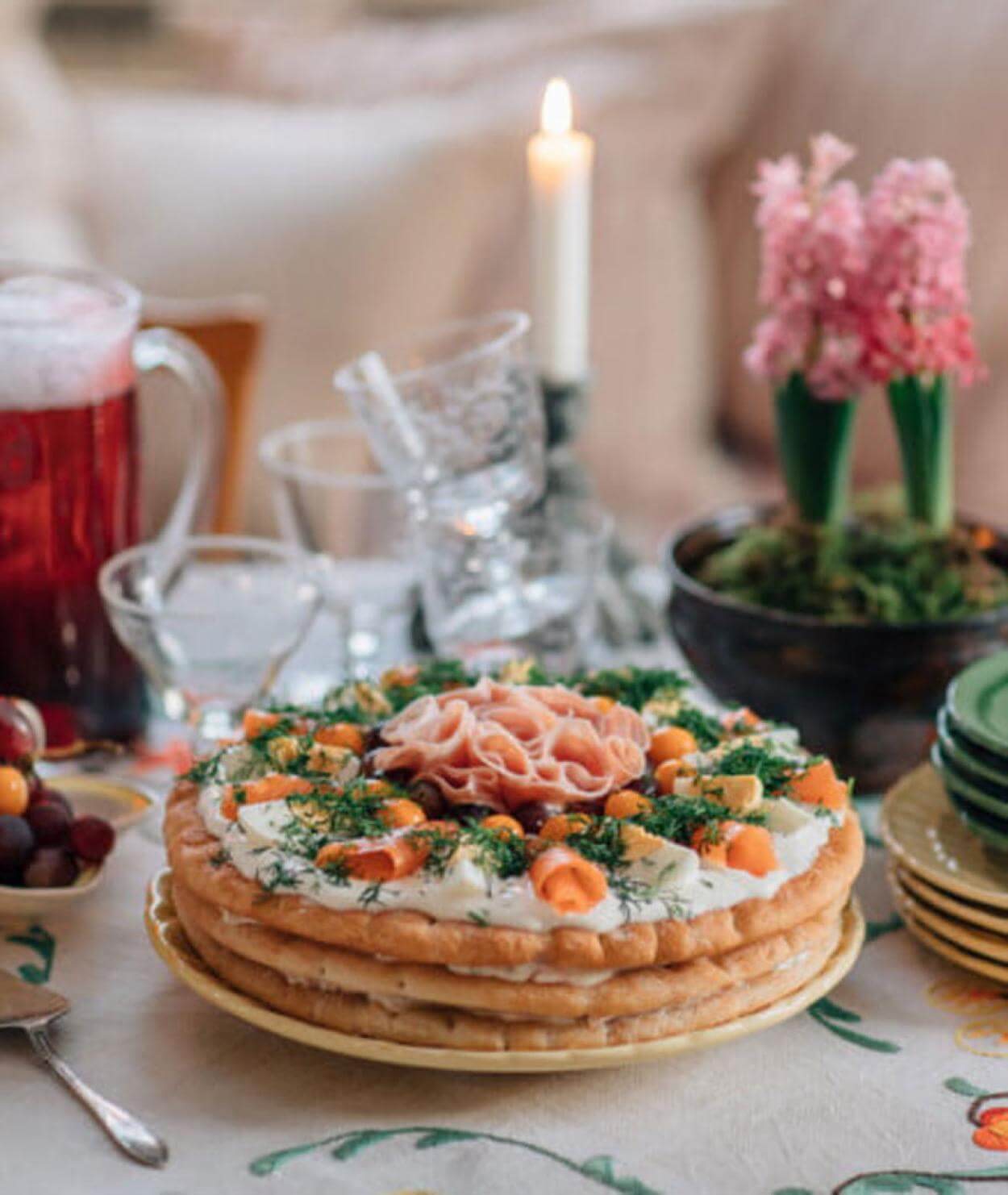 - Avsluta med ett lager Jubileumskaka och toppa med den sista oströran. Bred ut och dekorera sedan med lax, ägg, skinkrullar, vindruvor, physalis och dill.