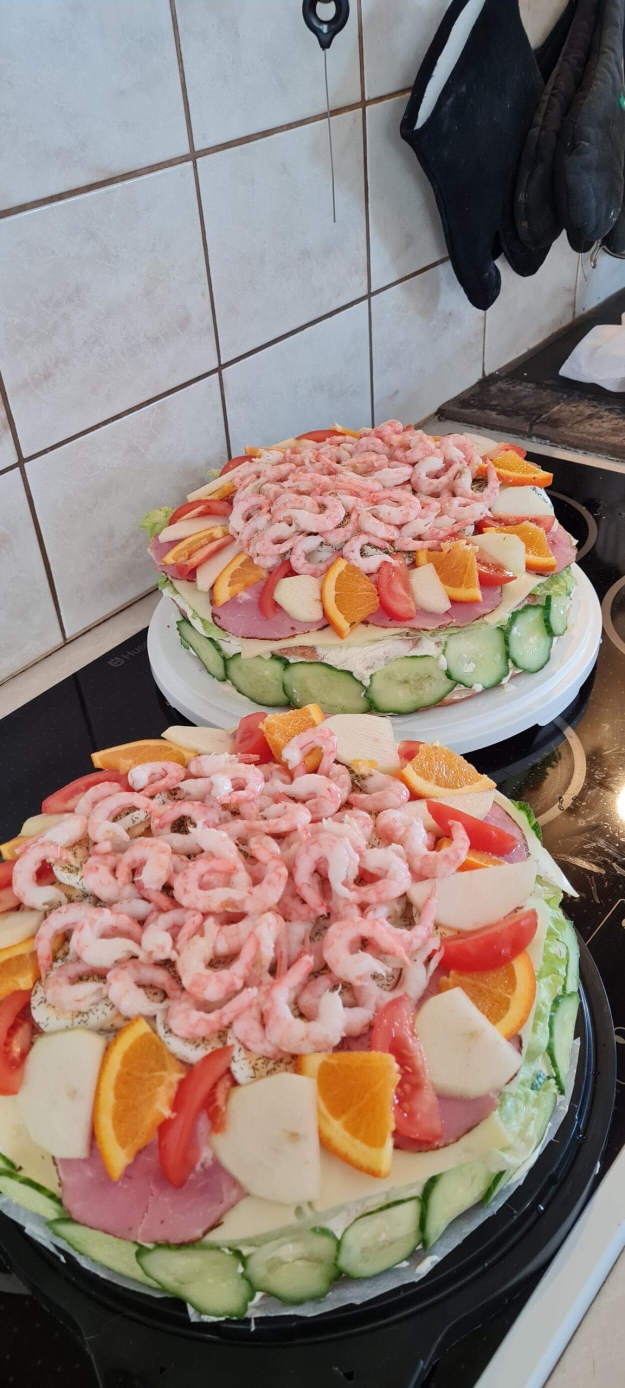 - Överst täcks allt med salladsblad, ostskivor, rökt skinka, ägg i skivor, räkor, apelsinskivor och dill.