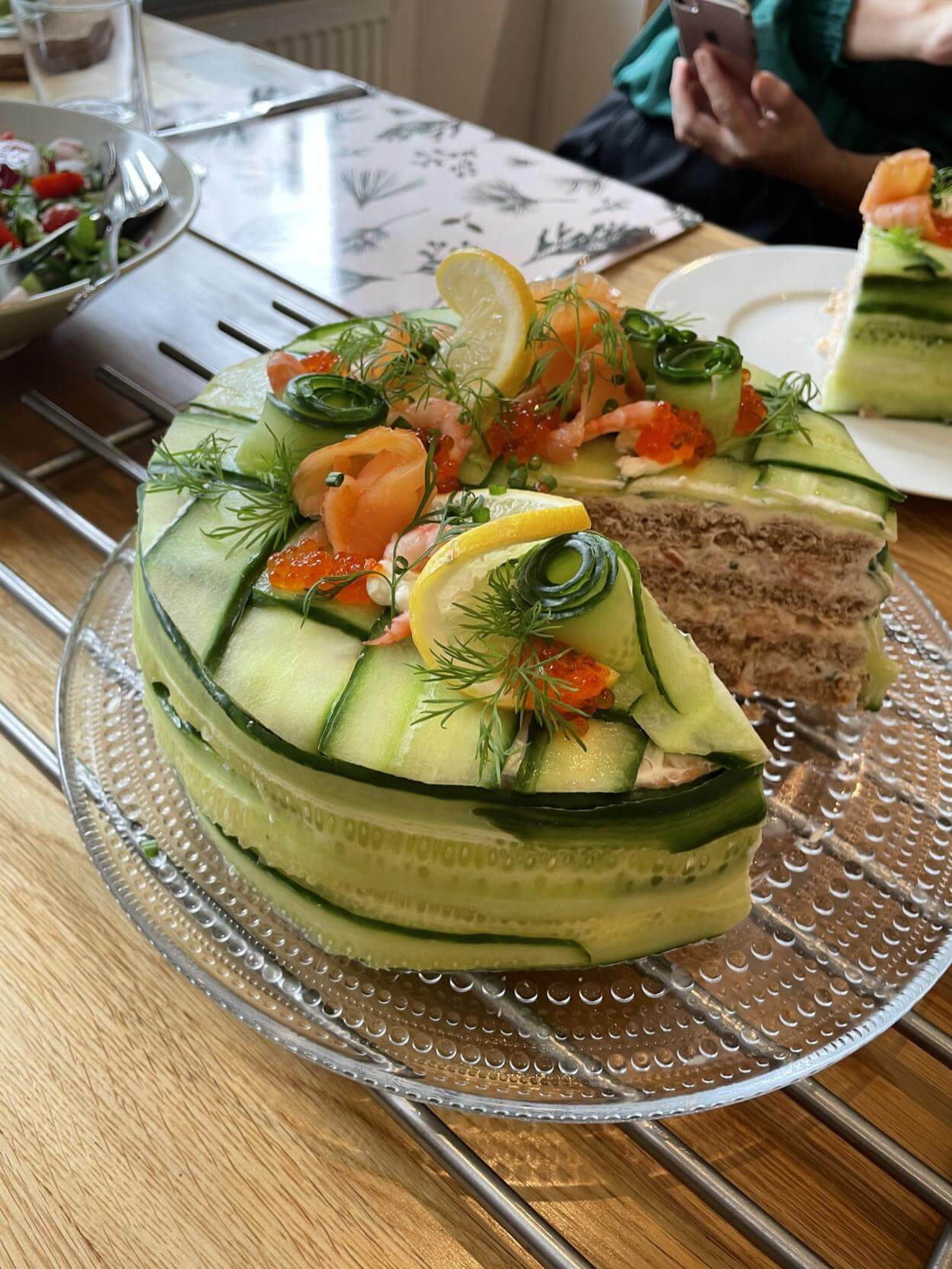 - Dekorera tårtan med hyvlad gurka eller ärtskott. Rulla ihop de sparade lax skivorna och lägg på toppen. Skiva citron tunt och gör ett hack så de kan ställa sig eller låt kreativiteten flöda och pynta den med allt du tycker är gott!
