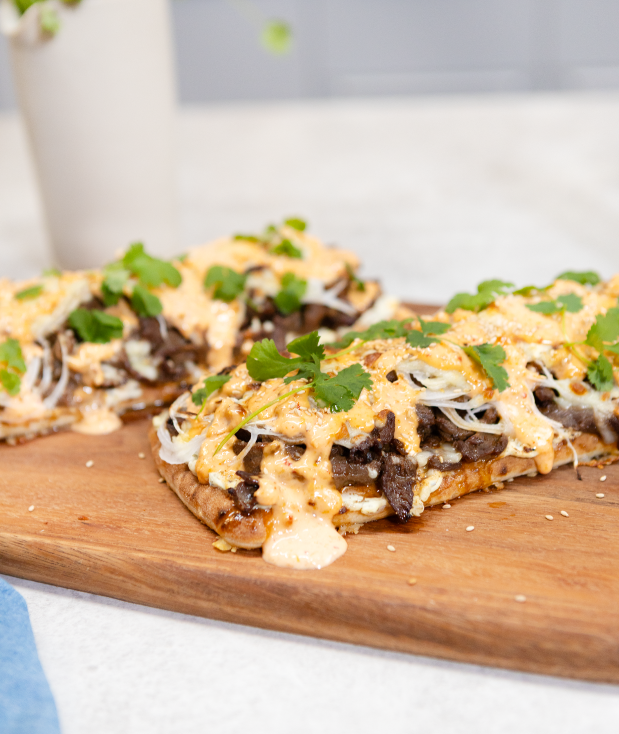 - Montering & gratinering: Sätt ugnen på 225° grill. Bred ett generöst lager färskost på brödet. Fördela bulgogiköttet jämnt.Lägg på ett tunt lager skivad silverlök, salta & peppra. Toppa med riven mozzarella och cheddar. Baka i ugnen ca 5 minuter eller tills osten är smält och bubblig.