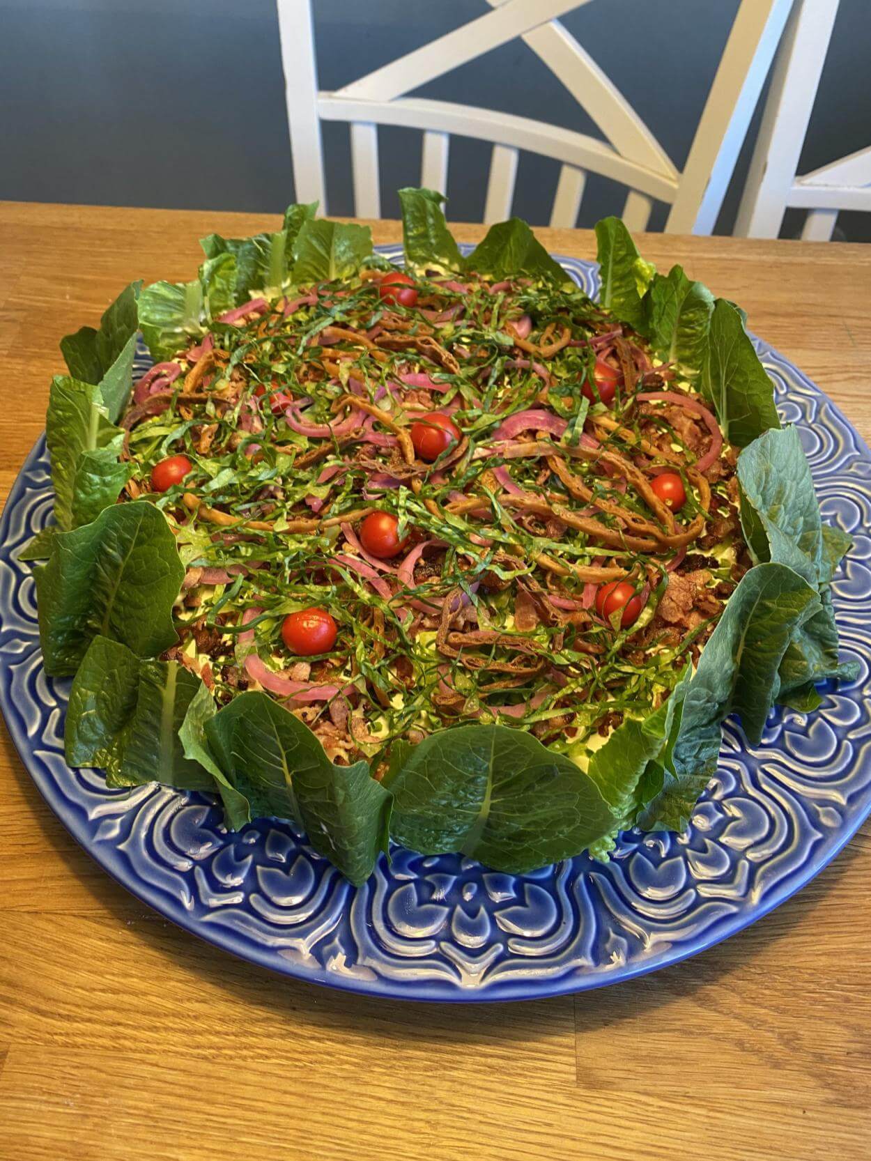 - Skölj och skär romansallat i önskad höjd för att täcka sidorna av tårtan, strimla även ca 3 blad för att använda till topping.