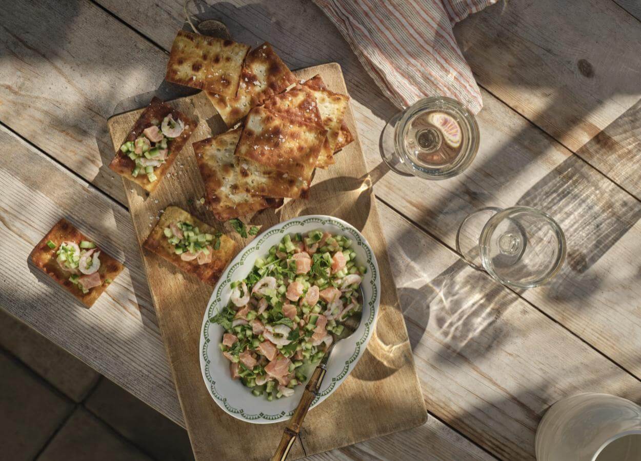 - Ta fram skålen med lax och räkor, tillsätt fintärnad gurka, hackad koriander och salladslök.