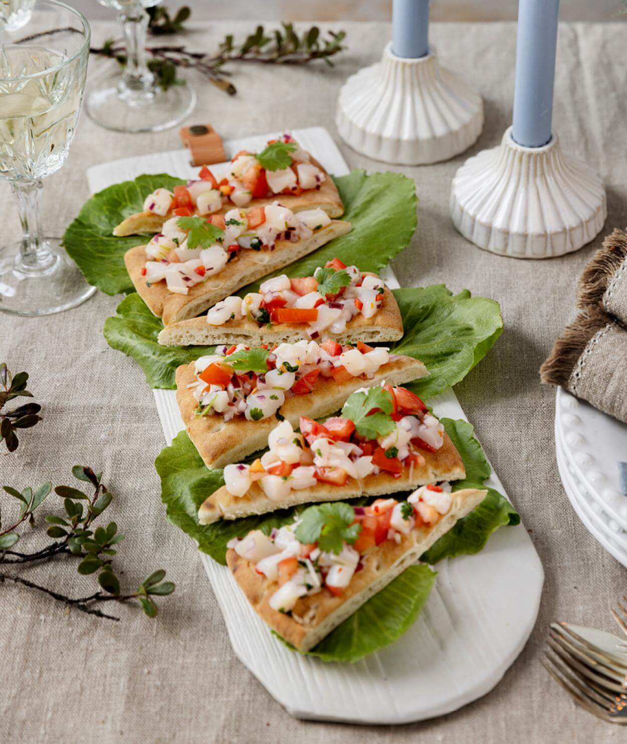 Smart sätt att servera ceviche på, dessutom är rostat bröd och ceviche verkligen gott ihop så de här snittarna gör succé som förrätt. Extra lyxigt med ceviche på pilgrimsmussla, väldigt fräscht och lite annorlunda. Vi har räknat med att alla äter två snittar var som förrätt men vill du servera dem till fördrinken istället så räcker de till fler.