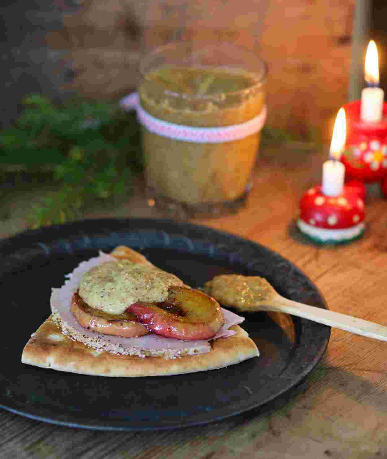 - Lägg skinkskivan på mackan, placera några ljumma äppelskivor ovanpå och klicka över lite pepparrotssenap.