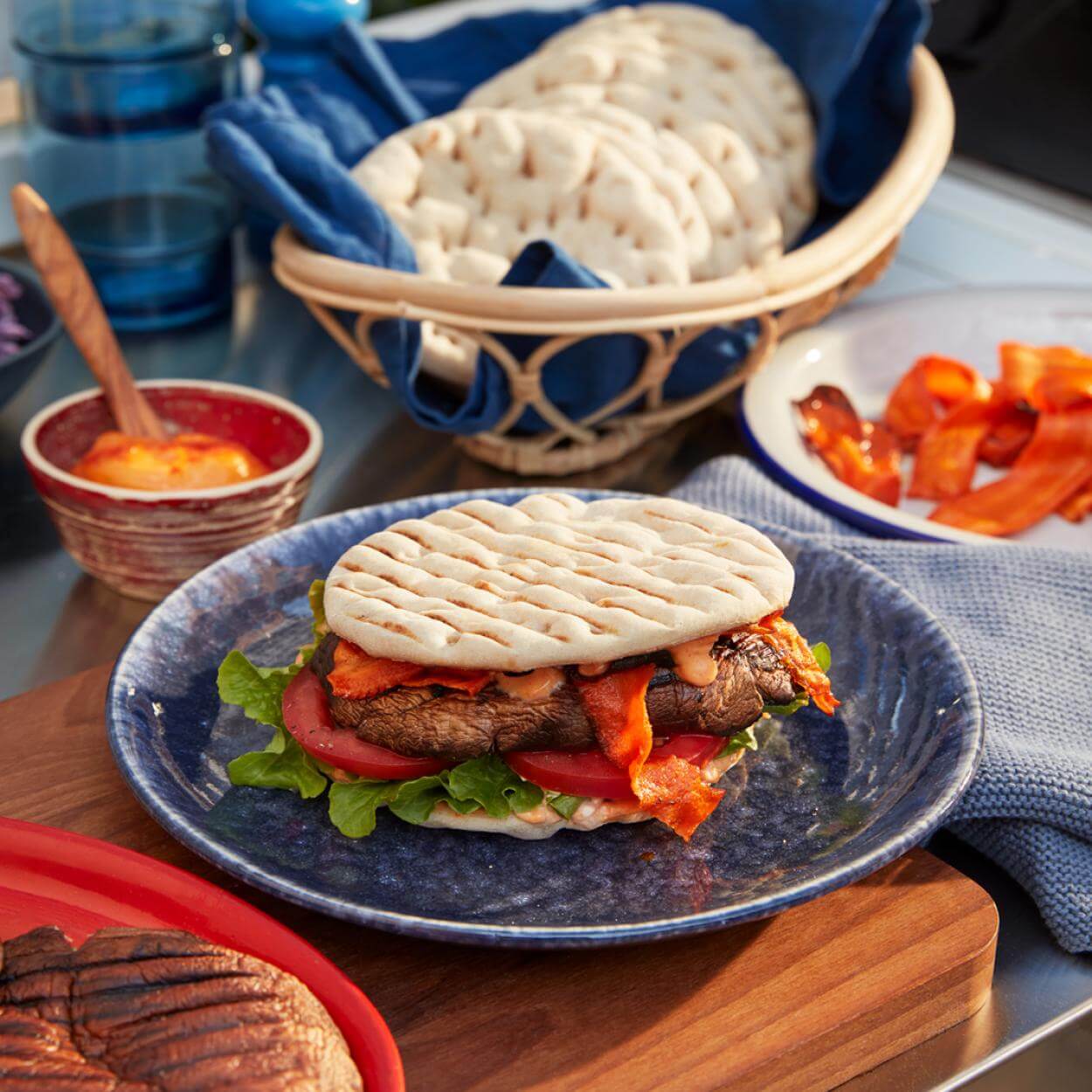 - Rosta rågkakorna en stund på grillen. Bred paprikamajonnäs på hälften av dem, lägg på sallad, tomat, portabellosvamp och morotsbacon.