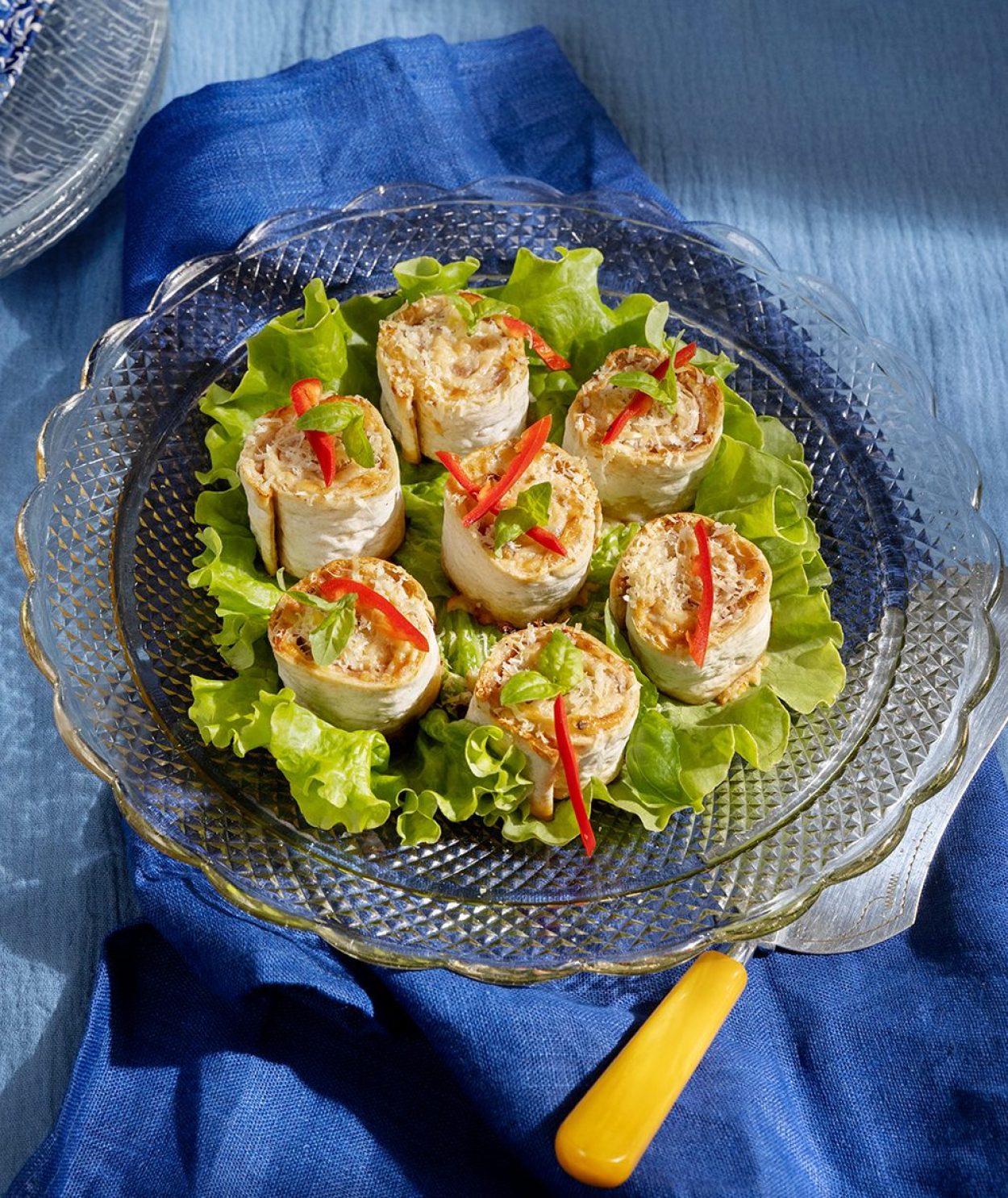 - Rulla ihop brödskivorna till rullar och snitta varje rulle i sex bitar.