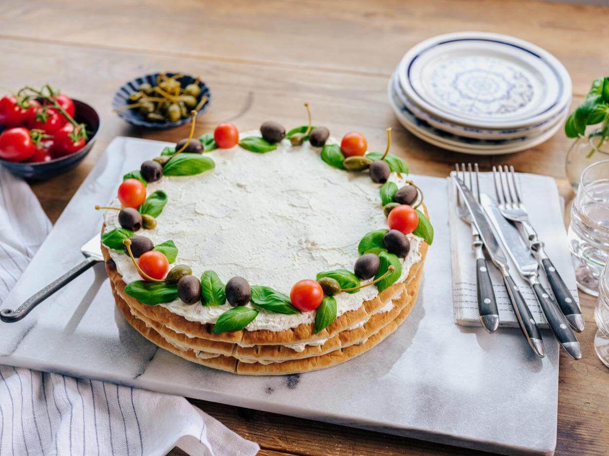 Smakrik smörgåstårta som påminner om salta bad och grekisk sallad vid stranden, matig och mättande, perfekt kvällsmat!