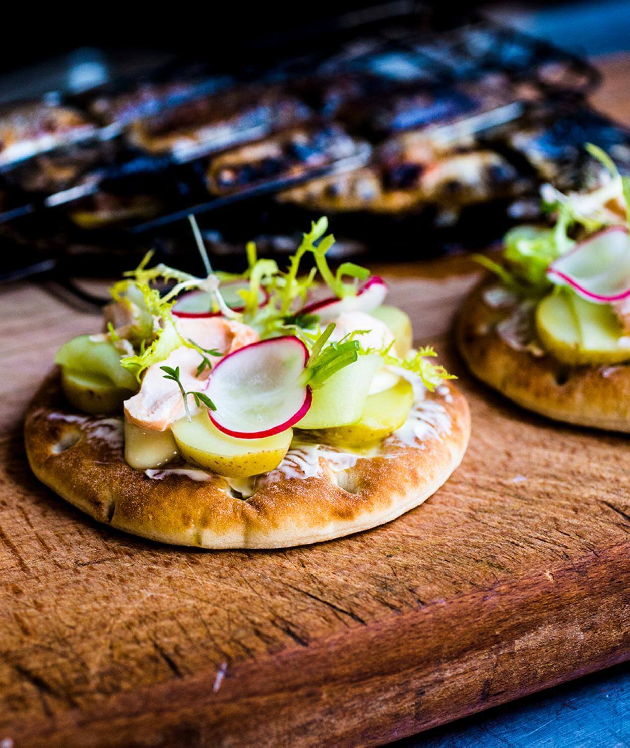 - Bygg vidare med potatis, rädisor och picklad gurka. Garnera med frisésallad och krasse. Servera gärna lite extra smöremulsion vid sidan.