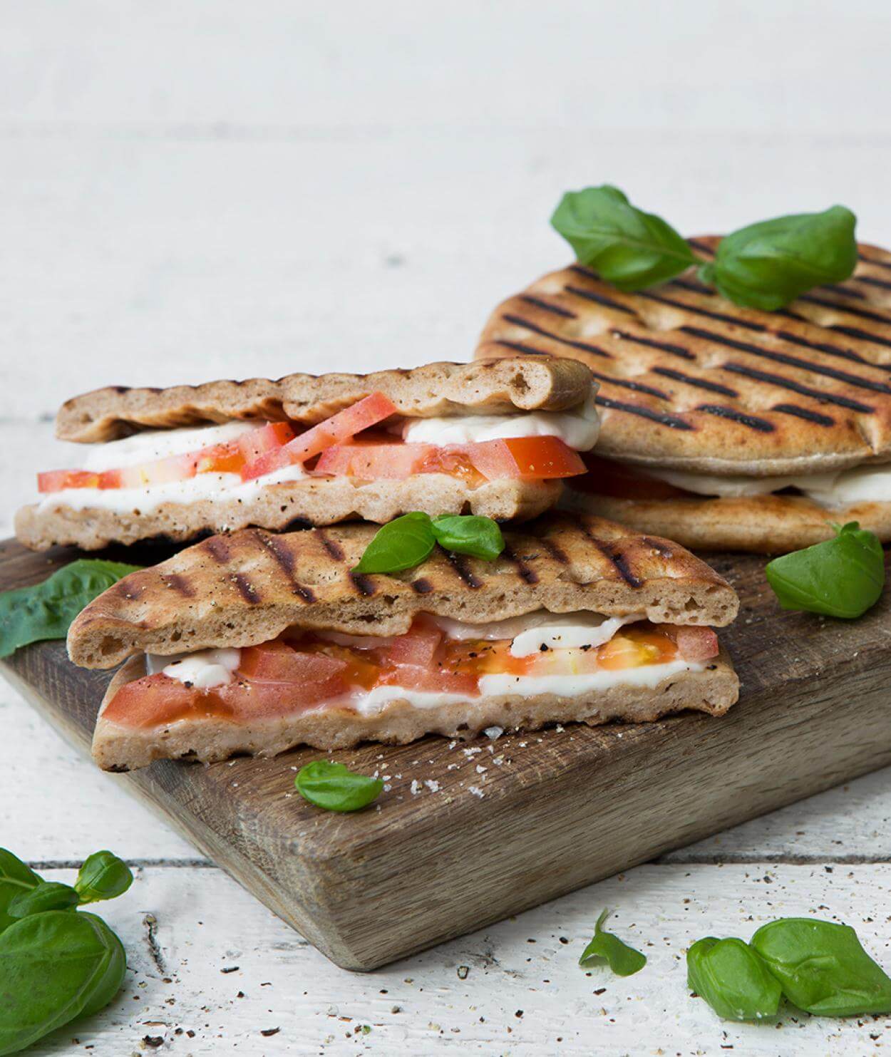 - Fördela mozzarella och tomat på fyra av brödskivorna, salta och peppra och toppa med resterande brödskivor.
