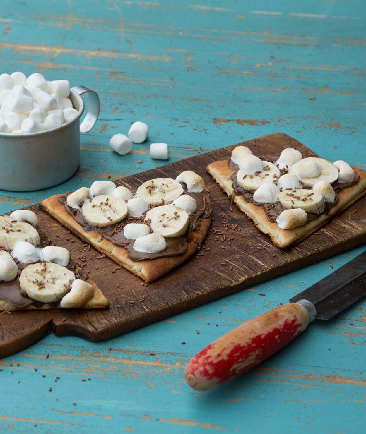 - Bred ut nötkräm på brödet, skiva bananen och fördela ovanpå, strö över marshmallows.