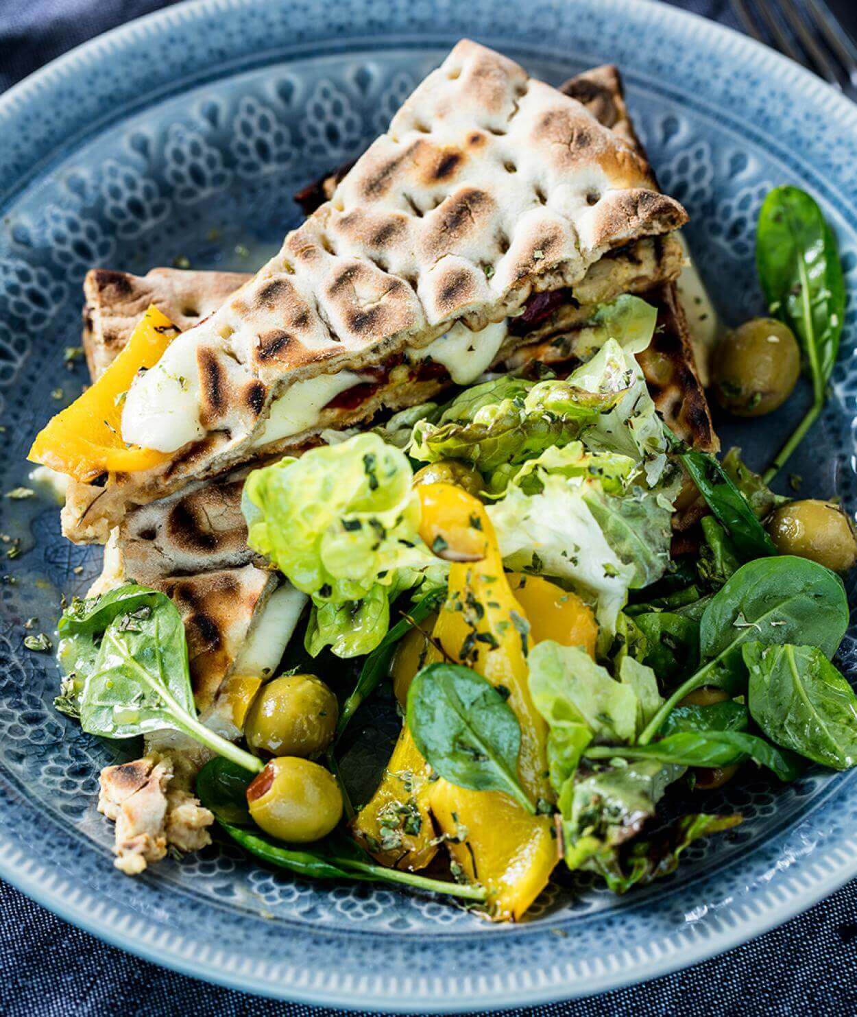 Grillmacka med ärthummus, grillad paprika, oliver och mozzarella