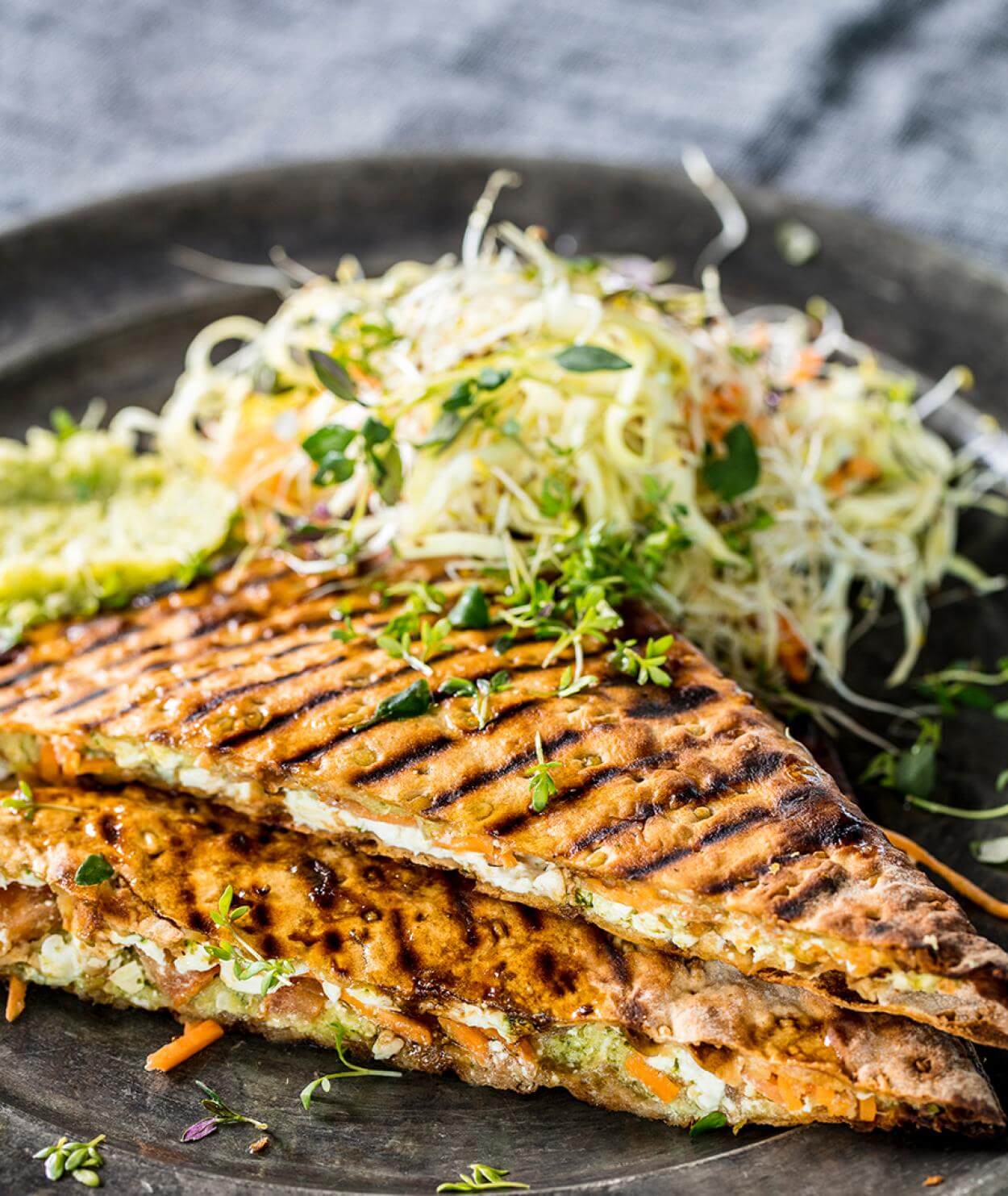 - Bred pesto över brödskivorna, lägg på tomat, strimlad morot och fetaost på halva sidan. Vik ihop.
