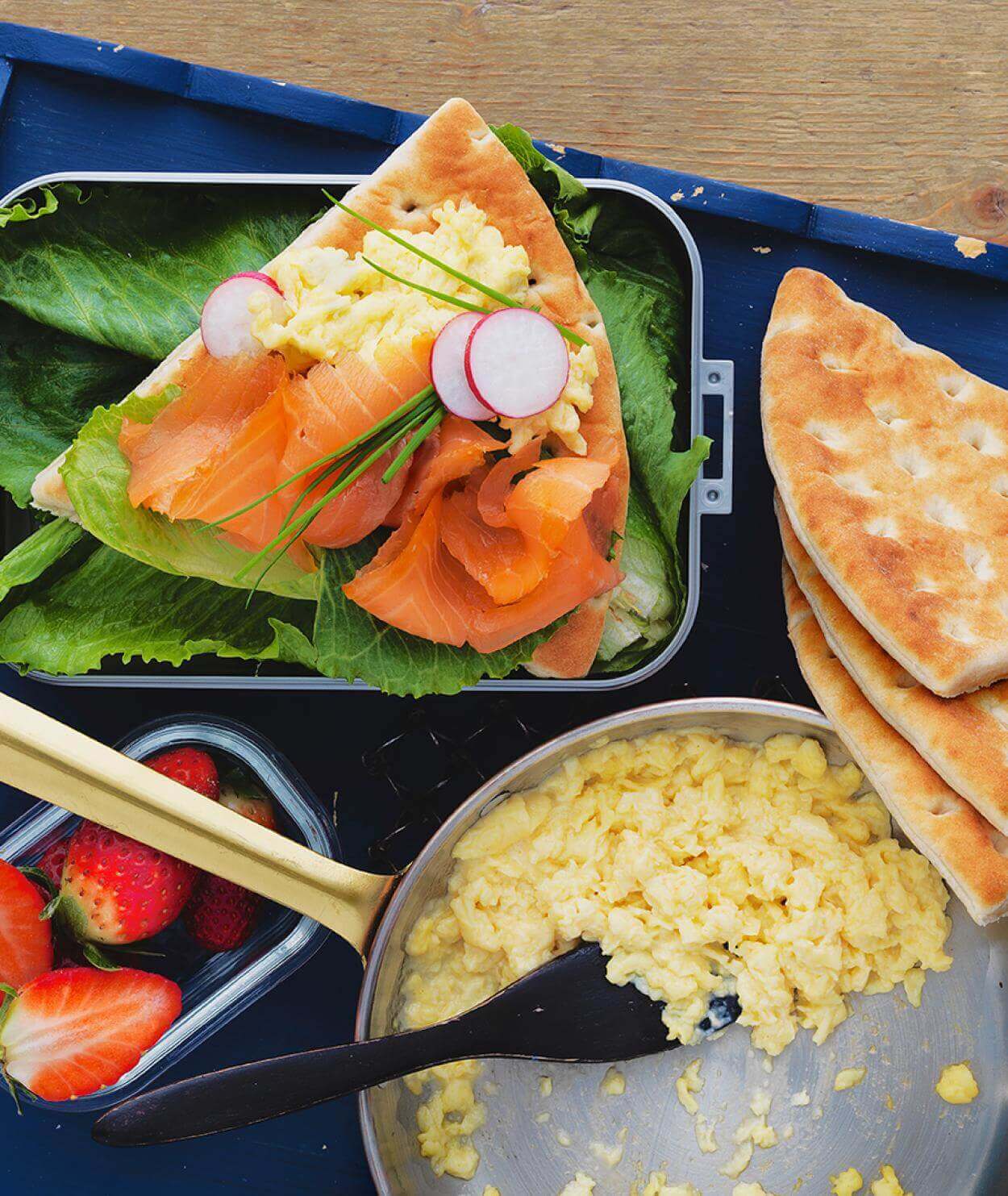 - Fördela äggröran på brödskivan, lägg på lax, skivade rädisor och några gräslöksstrån.