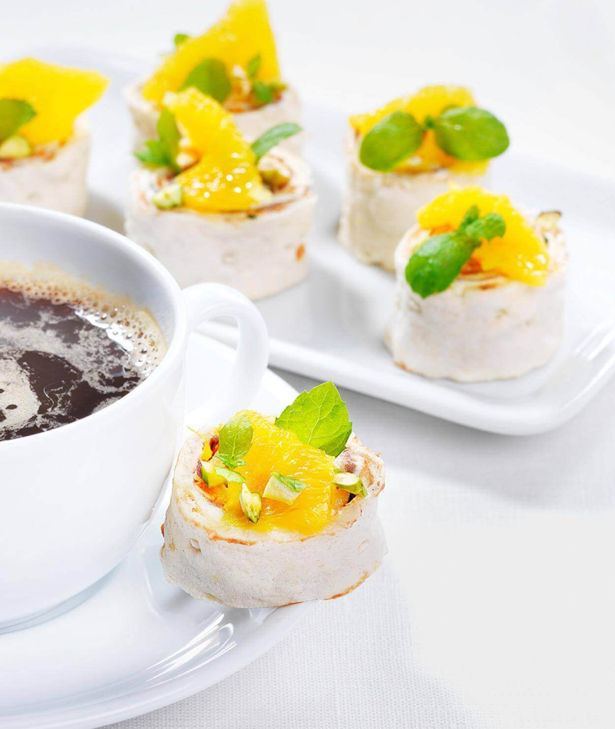 - Toppa med små bitar av apelsinskivor, hackade pistagenötter och myntablad.